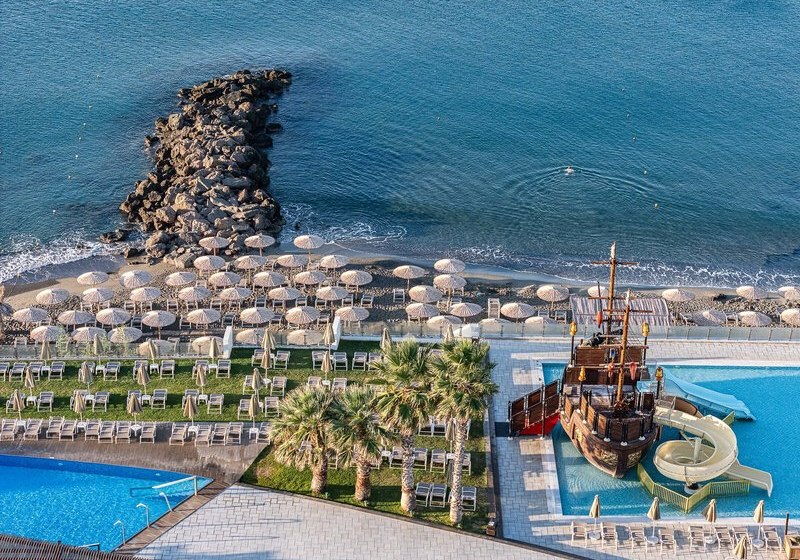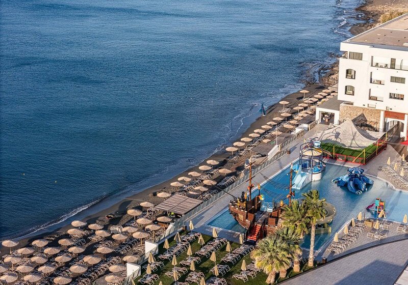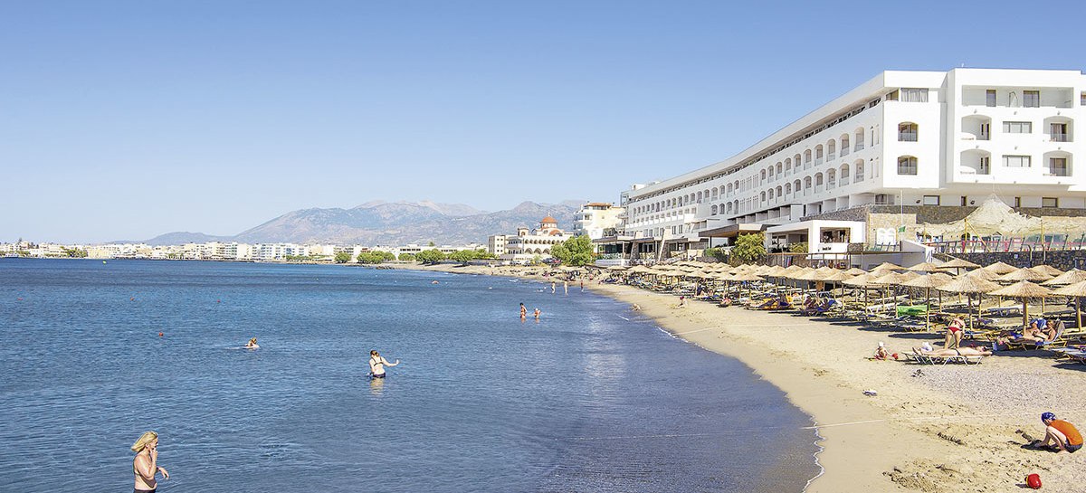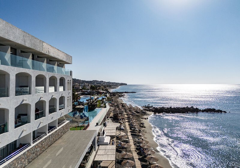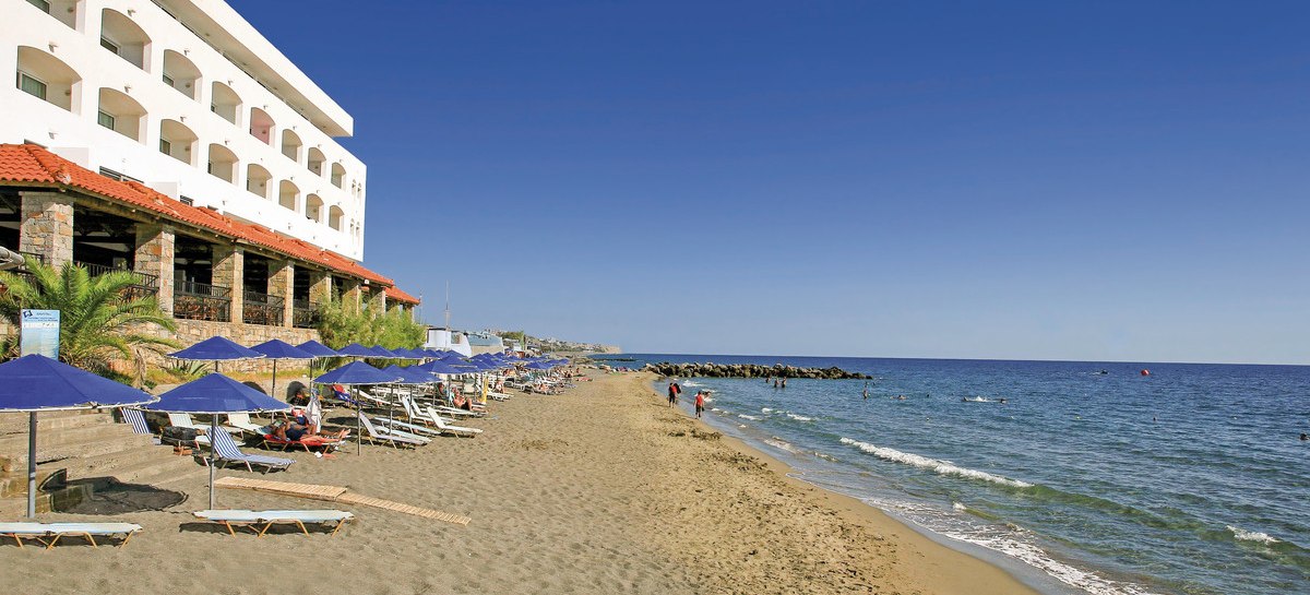 Im Petra Mare Hotel wohnt Ihr direkt am Sand- und Kiesstrand von Ierapetra. Das Haus vermittelt ein entspanntes Strandgefühl mit klarer Struktur: kurze Wege, ein weitläufiger Außenbereich mit Meerwasser-Pool und Hydromassage, viel Licht und Blick auf das Wasser. Familien schätzen den Kinderpool mit Piratenschiff und Rutschen, Paare die ruhigen Ecken auf der Sonnenterrasse. Abends locken das Freilichttheater und die offene Luft der Uferpromenade.