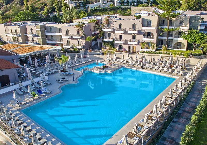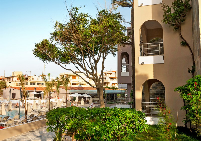 Im Porto Platanias Village Resort erwartet Euch ein übersichtliches Resort mit klaren Linien, gepflegten Wegen und Bereichen zum Ankommen. Die Anlage wirkt angenehm aufgeräumt: Zwei Etagen, 199 Wohneinheiten, mehrere Lifte und eine Lobbylounge geben Struktur. Am Pool spürt Ihr den ruhigen Rhythmus des Hauses, während Ihr im WLAN verlässlich verbunden bleibt.