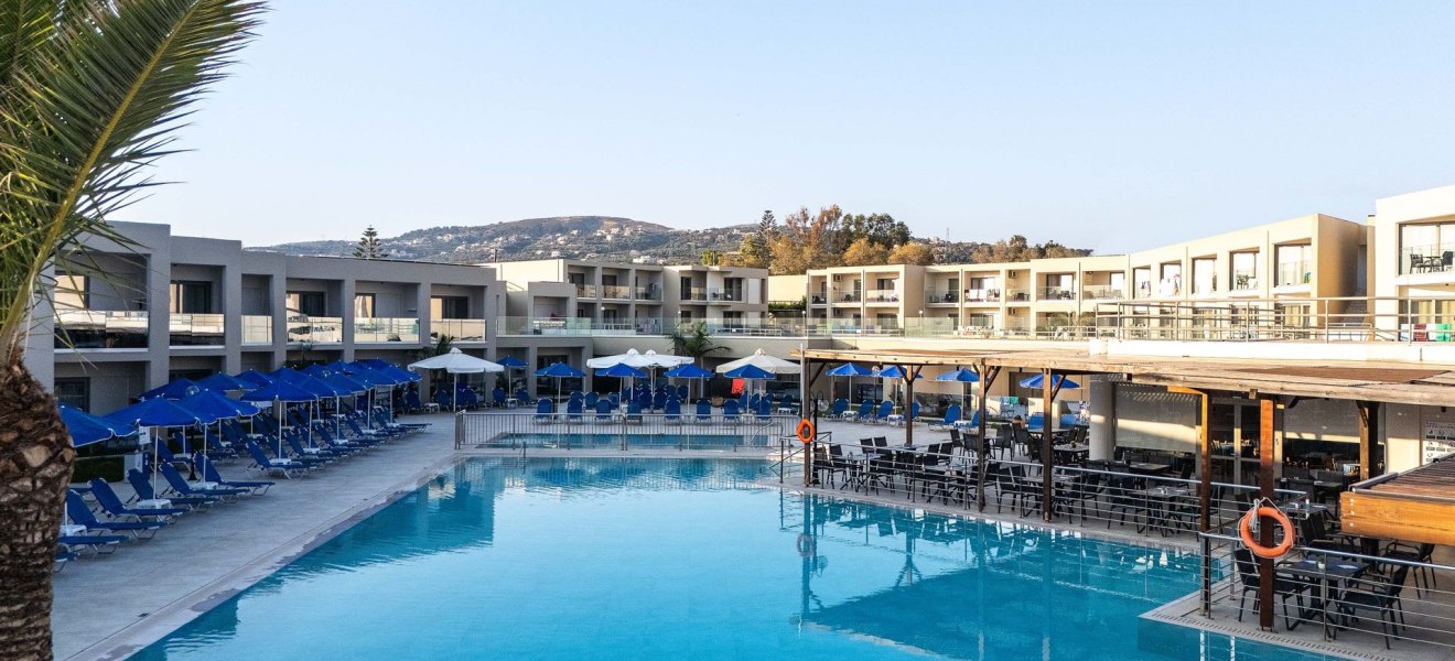 Im Rethymno Village erlebt Ihr ein griechisches Strandhotel, das angenehm unkompliziert wirkt und Euch mit kurzen Wegen durch den Tag führt. Die Anlage liegt in Platanias, etwa 6 km östlich von Rethymnon, und verbindet Strandnähe mit einer kompakten Struktur. Ein Süßwasserpool mit separatem Kinderbecken, eine Sonnenterrasse mit Liegen und Schirmen sowie eine Lounge mit Terrasse bilden die entspannten Treffpunkte. WLAN ist in der gesamten Anlage inklusive, die Rezeption ist rund um die Uhr besetzt.