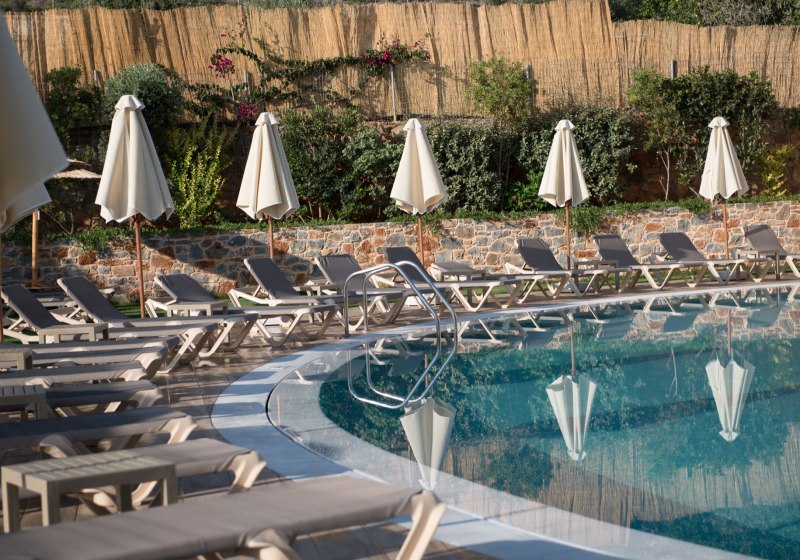 - Drei Pools: Außenpools mit Sonnenterrassen, Liegen und Schirmen.