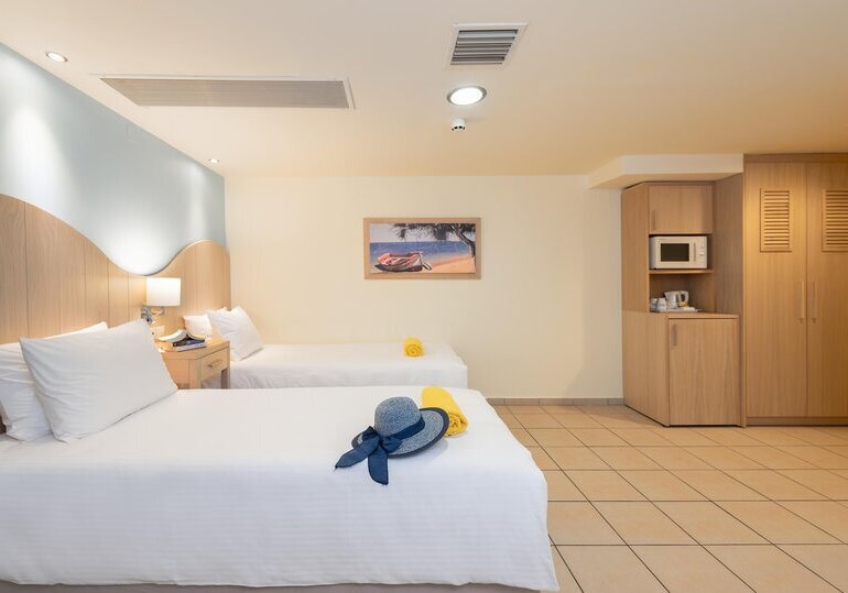 Ihr wohnt in freundlich ausgestatteten Zimmern mit individuell regulierbarer Klimaanlage, WLAN ohne Aufpreis, Safe und LCD-Sat-TV. Kühlschrank und Mikrowelle stehen bereit, dazu Kaffee- und Teezubereitung. Dusche/WC, Föhn sowie Balkon oder Terrasse runden das Setup ab – praktisch für Strandtage mit zwischendurch Pause im Zimmer.
