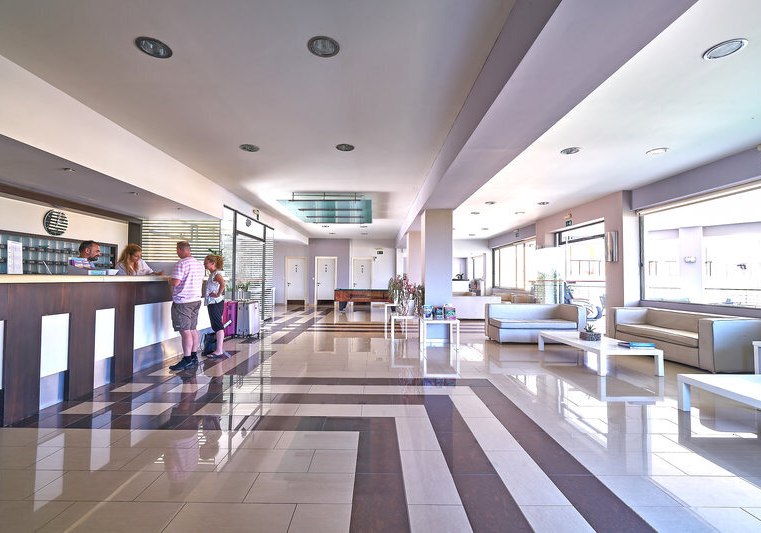 Die Anlage ist kompakt gedacht und alltagstauglich organisiert. Rezeption und Lobby bilden den Einstieg, WLAN deckt die gesamte Anlage ab. Auf der Sonnenterrasse orientiert Ihr Euch am Außenpool mit integriertem Kinderbecken. Badetücher gibt’s gegen Kaution. Parkplätze am Hotel stehen je nach Verfügbarkeit bereit und erleichtern Eure Wege.