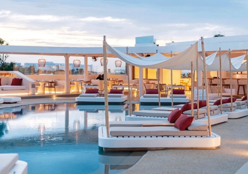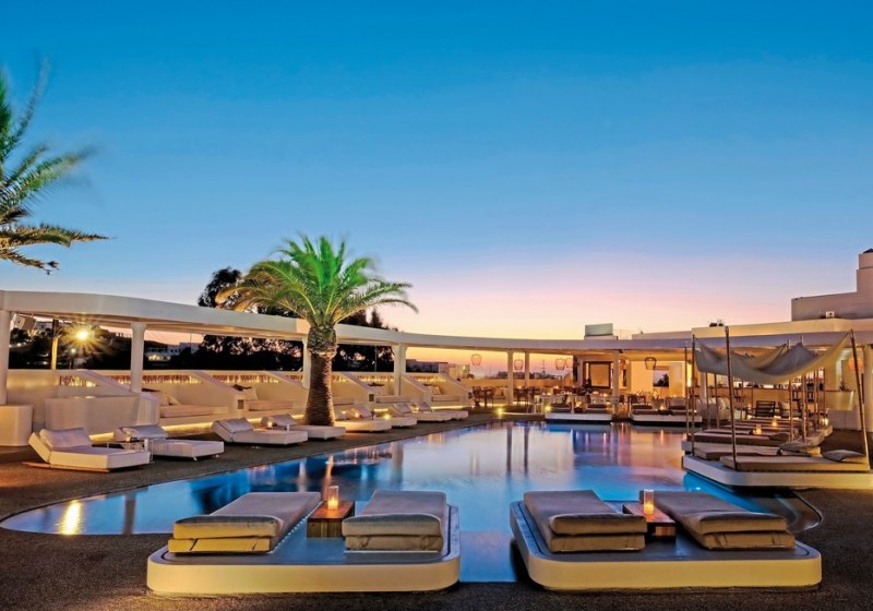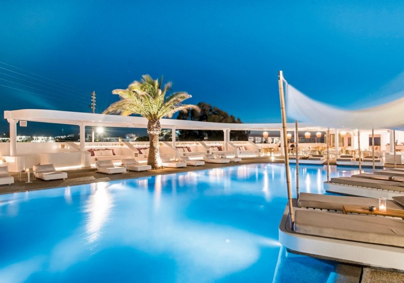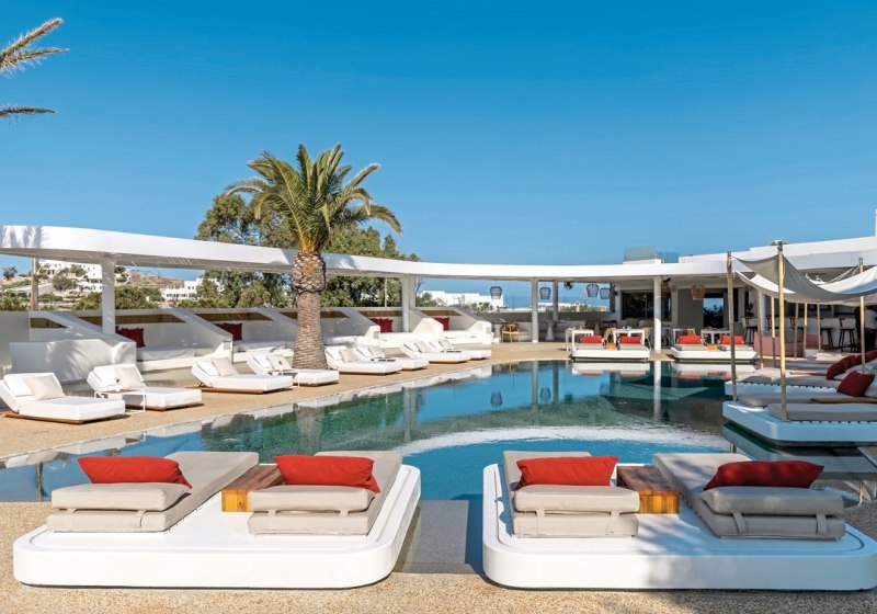 Wer den Radius erweitern will, erreicht Mykonos-Stadt nach etwa 1 km mit Bars und weiteren Locations. Die Lage eignet sich damit sowohl für entspannte Drinks am Pool als auch für einen längeren Abend in der Stadt. Highlight: Live-Musik onsite, Club für Spätprogramm, Stadt in Reichweite.