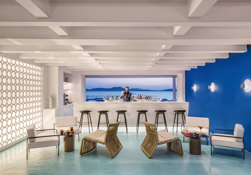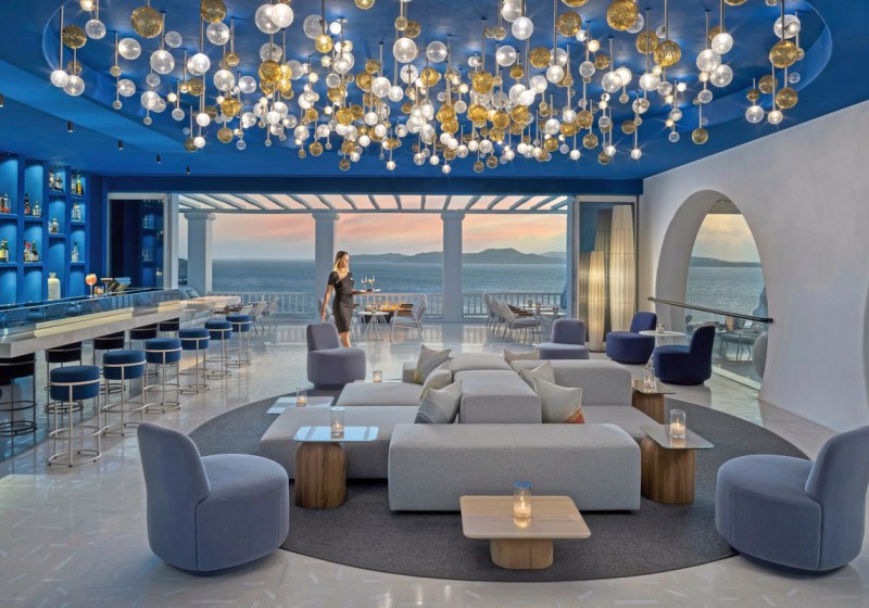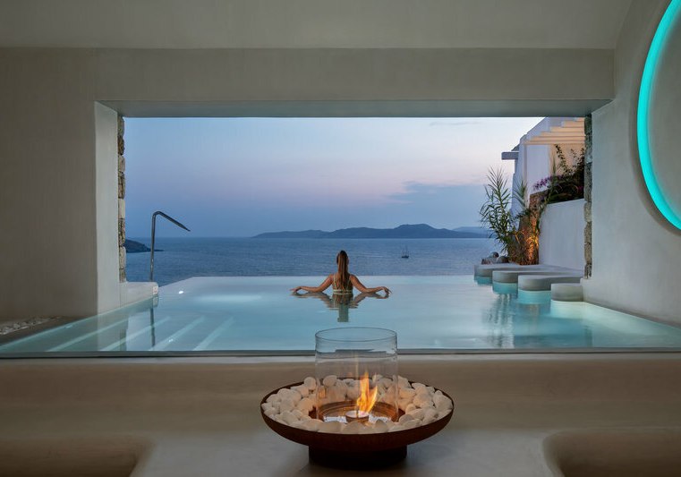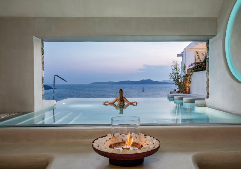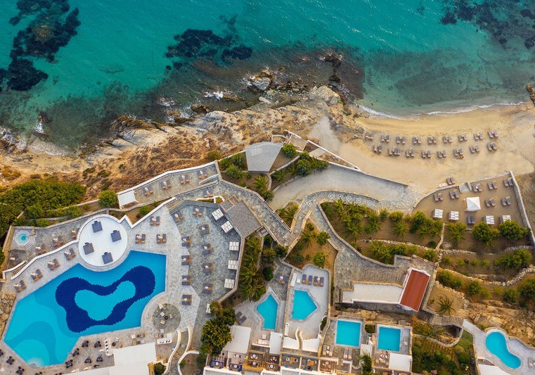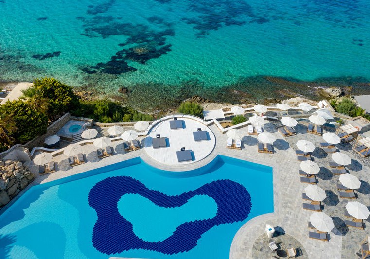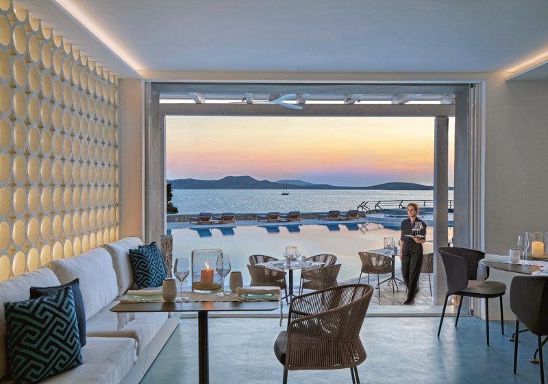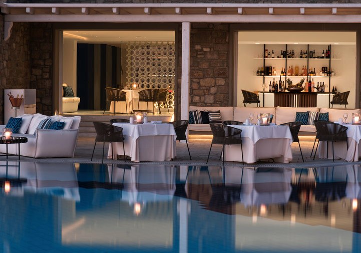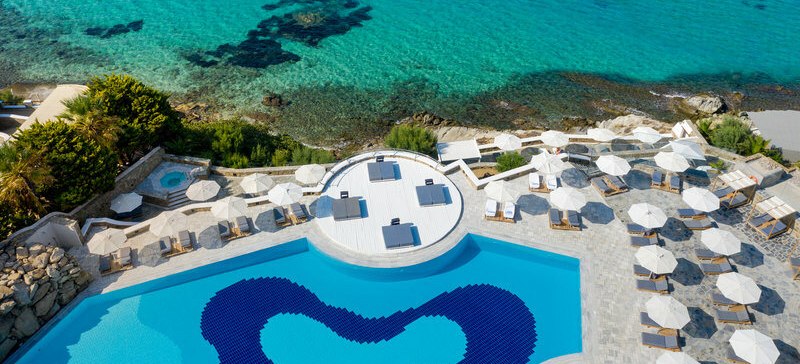 Mykonos Grand Hotel & Resort kombiniert direkte Strandlage mit präziser Infrastruktur: zwei Pools inklusive Adults-only-Infinitypool, stimmiges Spa mit Thalasso-Fokus, klar geführte Gastronomie und vielseitige Sportmöglichkeiten. Die Wege bleiben kurz, das Angebot bleibt überschaubar und hochwertig.