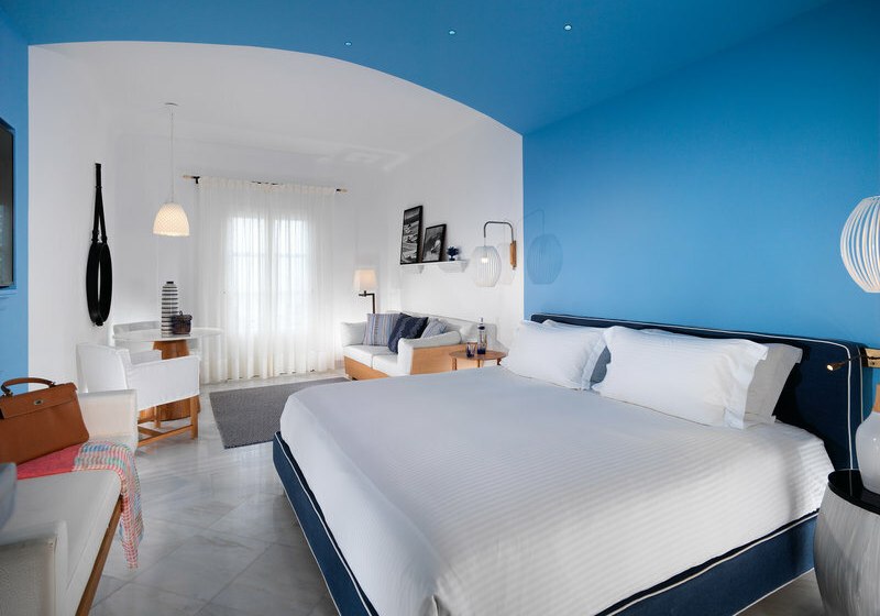 Im Mykonos Grand Hotel & Resort wohnt Ihr direkt am kleinen Sandstrand von Agios Ioannis. Die Atmosphäre wirkt klar strukturiert: großzügige Pools, mediterraner Garten, weite Sonnenterrassen. Als Mitglied von Small Luxury Hotels of the World setzt das Haus auf stimmige Details statt Effekthascherei. Highlight: Adults-only-Infinitypool kombiniert Ruhe mit offenem Blick auf das Meer.