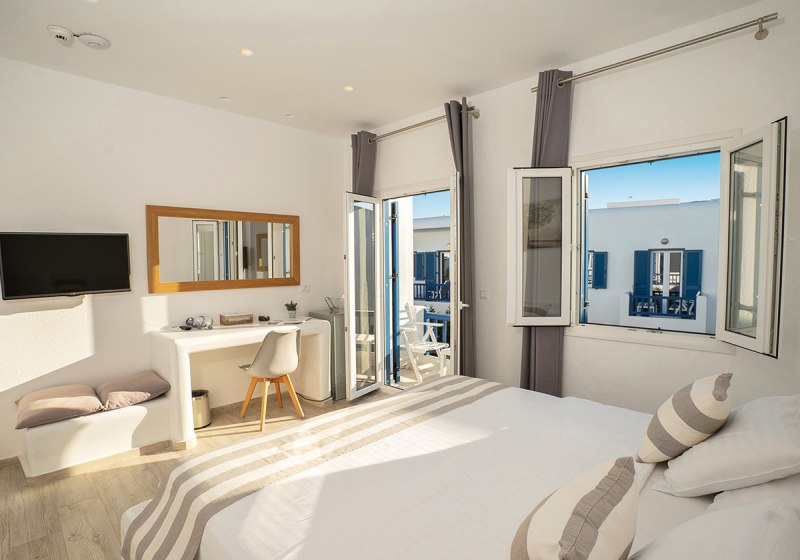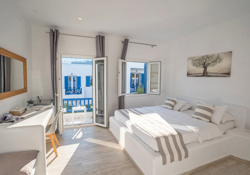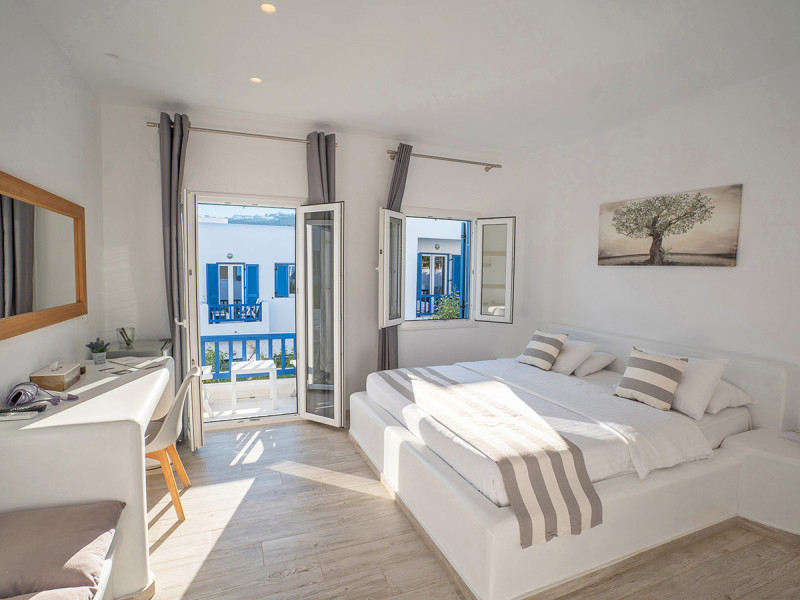 Der Fokus liegt auf entspannten Strandtagen und kurzer Distanz zu belebten Adressen. Bars und Strandtavernen liegen am Ort, Mykonos-Stadt erreicht Ihr nach etwa 3,5 Kilometern. WLAN verbindet Euch mit zuhause, während Ihr beim Frühstück auf der Terrasse den Blick schweifen lasst und den Tag in den Ferien ruhig beginnt.