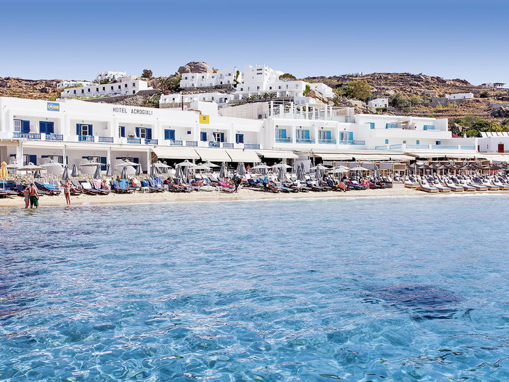 Direkte Strandlage, kurze Wege und eine Terrasse mit Meerblick prägen das Hotel Acrogiali. Ihr gestaltet entspannte Tage an der flach abfallenden Bucht und erweitert das Programm mit Bootsfahrten zu weiteren Stränden sowie Ausflügen nach Mykonos-Stadt.