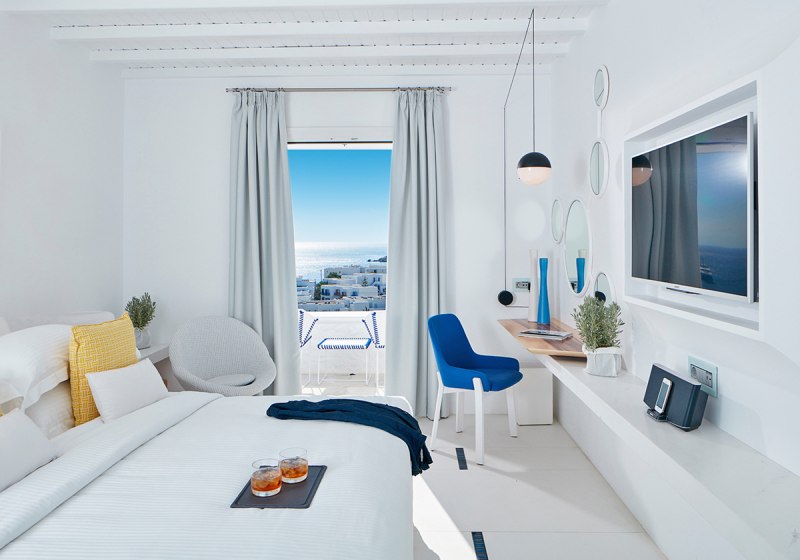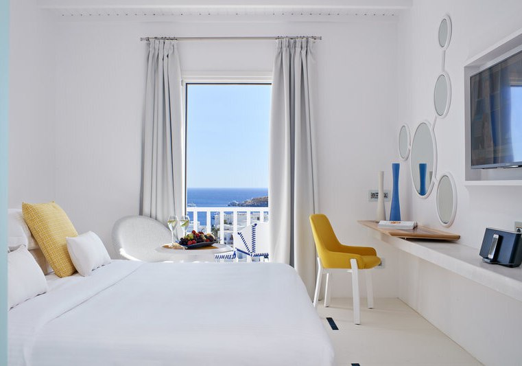 Die Zimmer des Myconian Ambassador Relais & Chateaux Hotel setzen auf klare Linien und gezielten Komfort. Ihr blickt – je nach Kategorie – seitlich aufs Meer oder frontal auf die Bucht; Balkon oder Terrasse öffnen den Raum nach draußen. Mit 28 bis 35 Quadratmetern bleibt es großzügig genug für entspannte Tage zu zweit oder als kleine Familie.