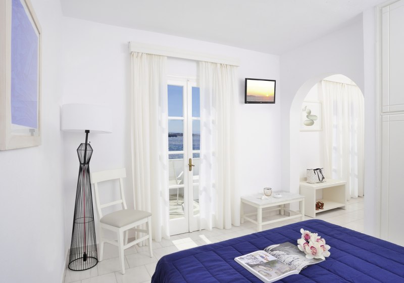 Im Mykonos Beach Hotel erwartet Euch ein überschaubares Haus mit 43 Wohneinheiten und einer entspannten, klar strukturierten Atmosphäre. Die Lage am Rand von Mykonos-Stadt und der kurze Weg zum Sandstrand prägen das Gefühl von Nähe und Leichtigkeit: morgens ans Wasser, abends ins Zentrum. Der Blick richtet sich auf das Wesentliche: kurze Wege, funktionale Bereiche, warme Materialien. Highlight: Überschaubares Strandhotel nahe Zentrum, kurzer Weg an den Sandstrand.