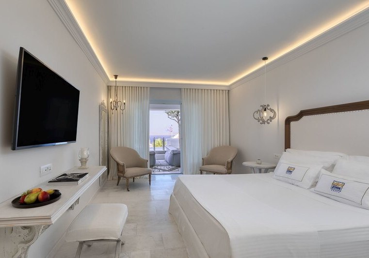 Die Zimmer verbinden klare Linien mit funktionaler Ausstattung: Klimaanlage, Safe, Sat-TV und WLAN bilden die Basis. Minibar, Kühlschrank sowie Kaffee- und Teezubereiter stehen bereit. Balkon oder Terrasse öffnen den Raum, in vielen Kategorien ergänzt Meerblick die Szenerie. Hochwertige Badartikel, Bademantel, Haartrockner und Hausschuhe sorgen für ein gepflegtes Badgefühl.