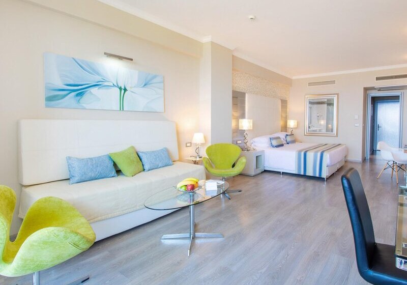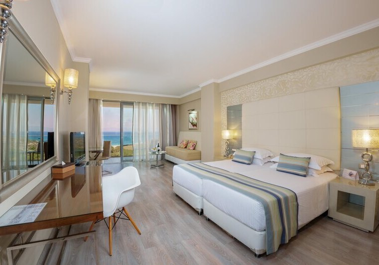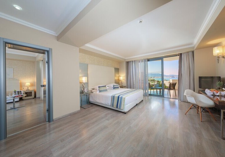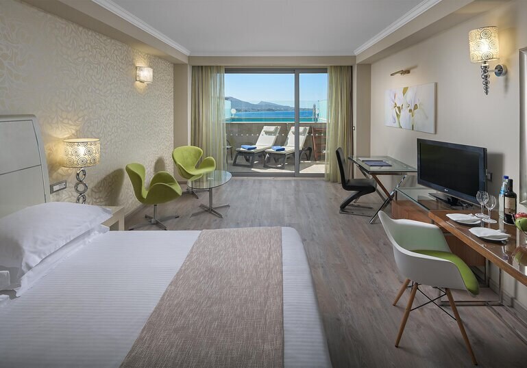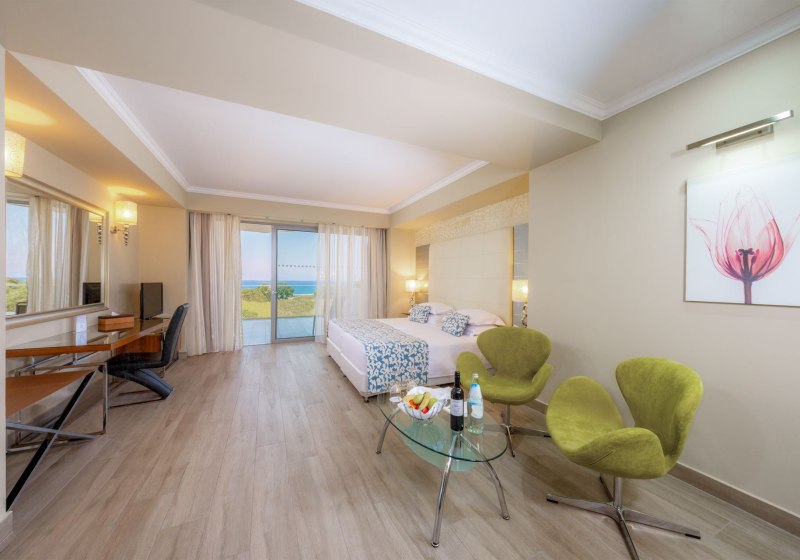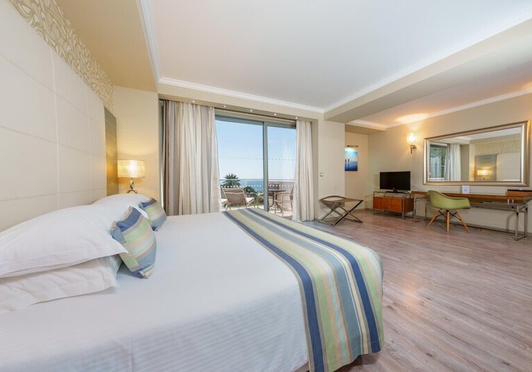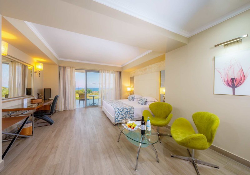 Ihr wohnt in großzügigen Zimmern ab etwa 42 m², ausgestattet mit Klimaanlage, Sat-TV, WLAN, Safe, Minibar und Telefon. Für Heißgetränke stehen Wasserkocher, Teezubereiter und Nespresso-Maschine bereit. Balkon oder Terrasse öffnen den Blick, teils auf das Meer. Bad/WC, Föhn, Pflegeprodukte, Bademantel und Hausschuhe runden den Komfort ab.