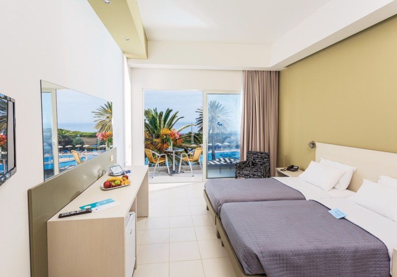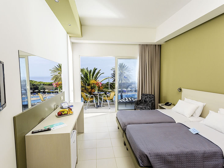 Zur Auswahl stehen Doppel- und Dreibettzimmer, Familienzimmer sowie Einheiten mit Garten-, Meer- oder Panoramablick. Es gibt Erdgeschoss- und obere Etagenlagen, teils in Aufzugnähe. Eine Sitzecke ergänzt ausgewählte Kategorien. Babybetten sind auf Anfrage verfügbar, ein Zustellbett ist in bestimmten Zimmern vorgesehen.