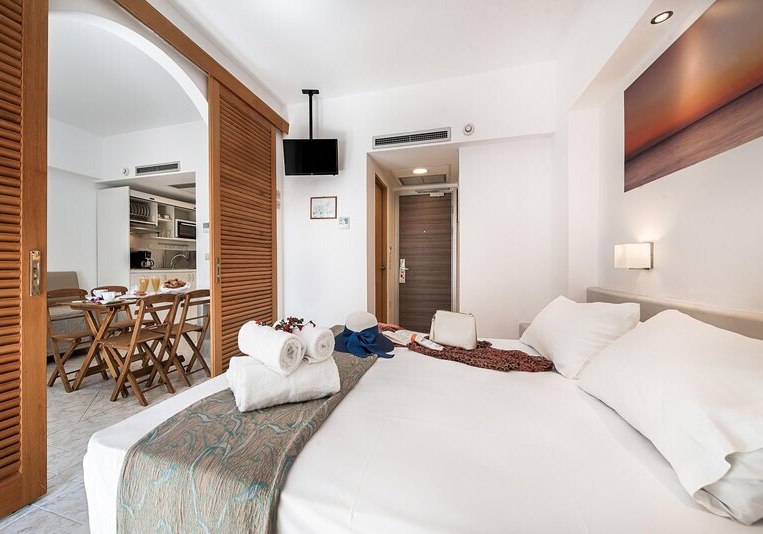 Ihr wohnt zentral in Rhodos-Stadt. Der Strand liegt etwa 100 Meter entfernt, die Altstadt erreicht Ihr zu Fuß in rund 20 Minuten (ca. 800 Meter). Ins Stadtzentrum sind es ungefähr 200 Meter, zur Bushaltestelle etwa 100 Meter. Bars, Clubs und das Meer befinden sich in etwa 200 Metern, Restaurants bereits nach rund 20 Metern. So plant Ihr spontane Abstecher ohne lange Wege.