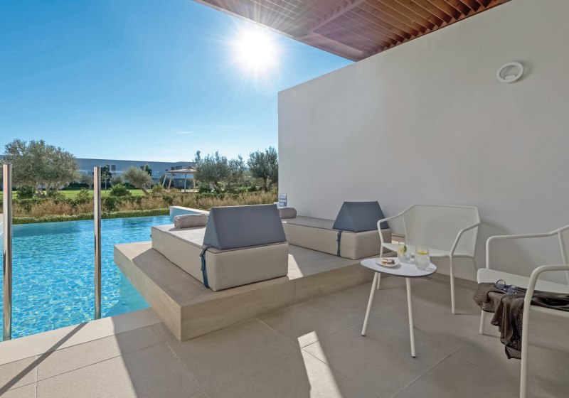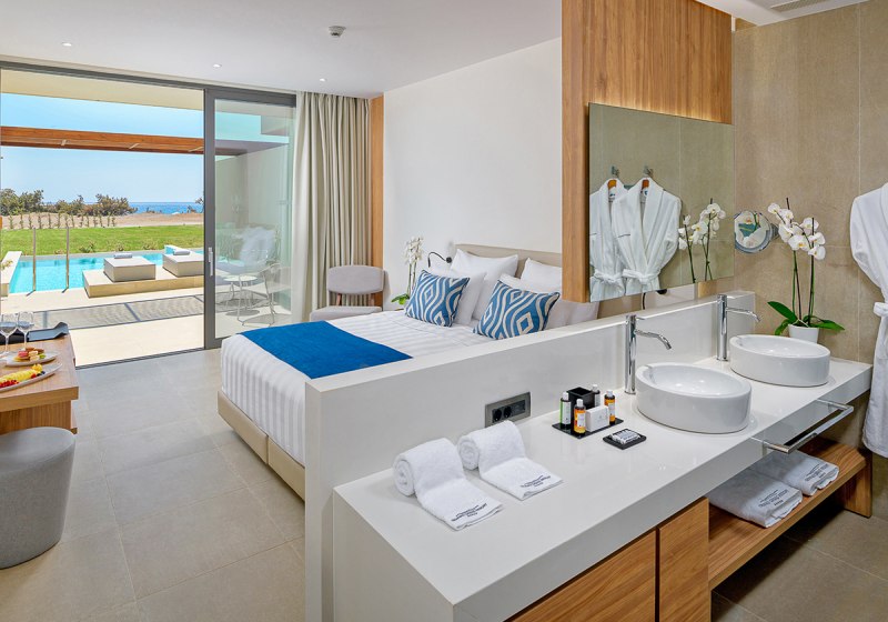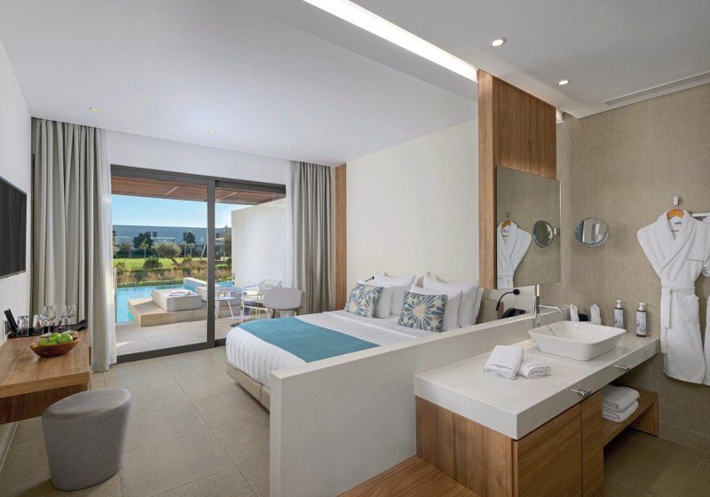 Kingsize-Bett, Kaffee- und Teezubereiter, Turndown-Service sowie Balkon oder Terrasse runden das Setup ab. Wählt zwischen Doppelzimmern, Juniorsuiten, Suiten und Suiten mit zwei Schlafzimmern; Zimmer mit Meerblick oder privatem Pool sind verfügbar. So entscheidet Ihr zwischen Rückzug mit Panorama oder unmittelbarem Sprung ins eigene Wasser. Highlight: Zimmer mit Privatpool für maximale Ungestörtheit am eigenen Platz.