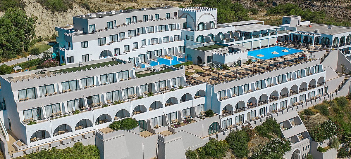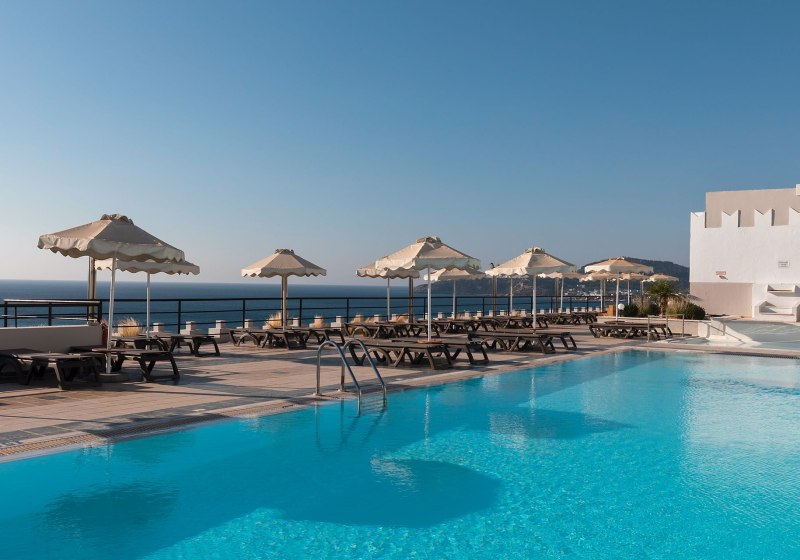 Im Calypso Palace wohnt Ihr am Hang über dem Strand von Faliraki – mit weitem Blick auf die Küstenlinie und kurzer, klar geführter Verbindung zum Meer über eine Unterführung. Die Atmosphäre wirkt entspannt und geordnet: 139 Zimmer verteilen sich auf sieben Etagen, dazu eine Empfangshalle mit Rezeption und Lifts. WLAN im gesamten Hotel hält Euch jederzeit verbunden, Strandtücher liegen bereits im Zimmer bereit. Der Pool liegt erhöht auf der vierten Etage, mit Sonnenterrasse und inkludierten Liegen und Schirmen – ebenso wie am Strand.