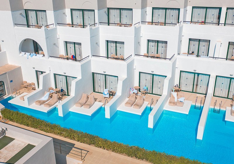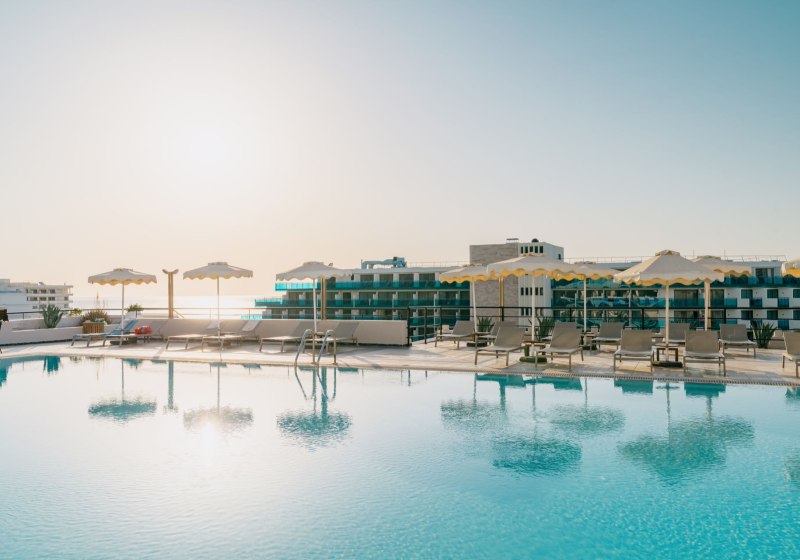 Die Infrastruktur ist wohldosiert: Empfangshalle mit Rezeption, Lifts und durchgängiges WLAN sorgen für eine klare Basis. Das Herzstück liegt erhöht – der Außenpool auf der vierten Etage mit Sonnenterrasse. Liegen und Sonnenschirme sind am Pool und am Strand inklusive; Strandtücher liegen bereits in Eurem Zimmer.
