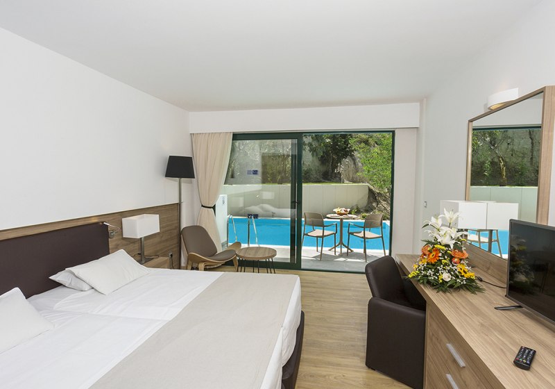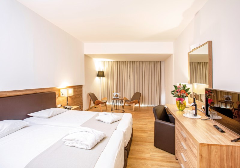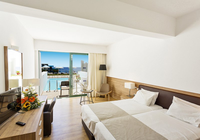 Mehr Raum geben die Juniorsuiten mit Couch oder die Suiten mit separatem Schlafzimmer und seitlichem Meerblick. Der funktionale Komfort bleibt identisch, die Perspektive variiert: vom Panoramablick über die Bucht bis zur ruhigen Rückzugsmöglichkeit am gemeinsamen Poolbereich. So passt Ihr das Zimmer exakt Eurem Reiseprofil an – zu zweit oder mit mehr Platzbedarf.
