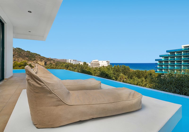 Ihr wohnt in Faliraki auf Rhodos, am Hang über dem Strandabschnitt von Faliraki. Der Strand ist durch eine Küstenstraße getrennt und bequem über eine Unterführung erreichbar. Das Zentrum von Faliraki liegt etwa zwei Kilometer entfernt, sodass Ihr zwischen ruhiger Hanglage und dem lebhafteren Umfeld des Ortes flexibel wechseln könnt – je nach Tagesplan und Laune in den Ferien.