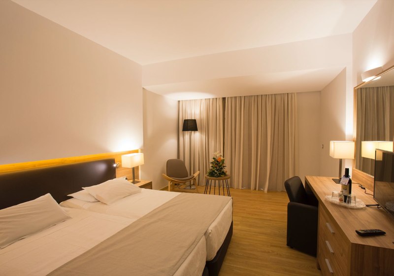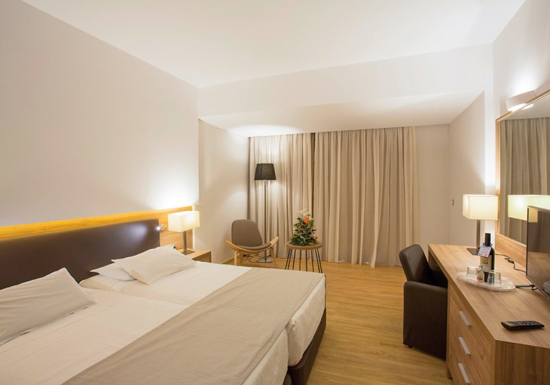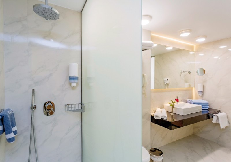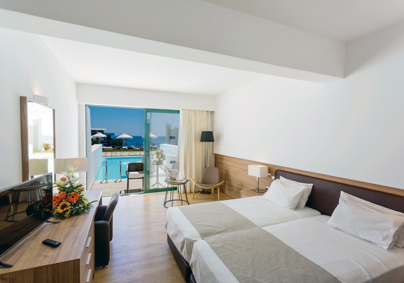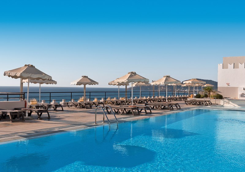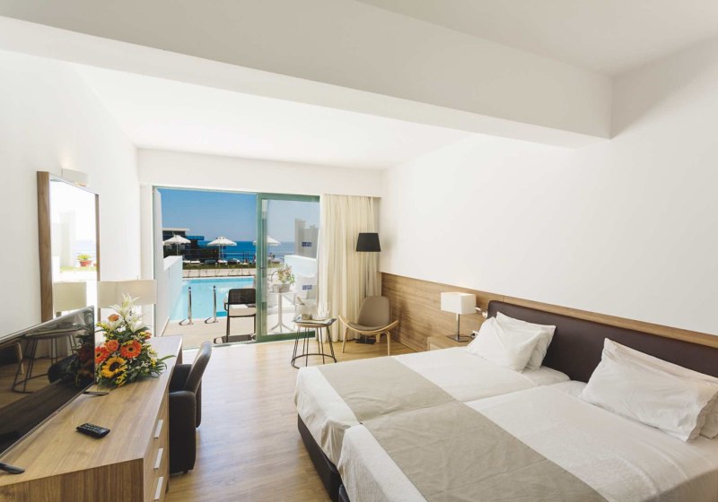 Alle Zimmer bieten Bad oder Dusche/WC, Föhn, Kühlschrank, Espressomaschine, Safe, Sat-TV, Telefon und Balkon. Für den Blick wählt Ihr Meerseite oder Panorama-Meerblick in den Etagen fünf bis sieben. Wer Wassernähe sucht, entscheidet sich für den Sharing-Pool-Zugang – mit direktem Schritt ins kühle Nass.