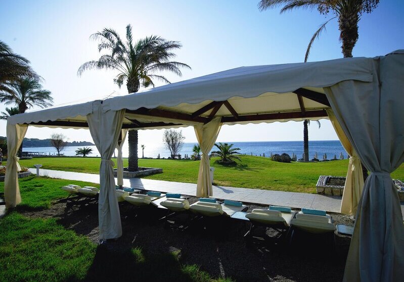 Ihr wählt zwischen zwei Restaurants, einer Snackbar und drei Bars. Die Mythos Lobby Bar und die Strandbar Poseidon geben dem Tag klare Genusspunkte – vom Begrüßungsgetränk bis zum Sundowner. Auf Wunsch stehen Halbpension, Vollpension und Zimmerservice bereit. Highlight: Speisekarten mit Kindermenüs und Diätoptionen erleichtern die Planung.