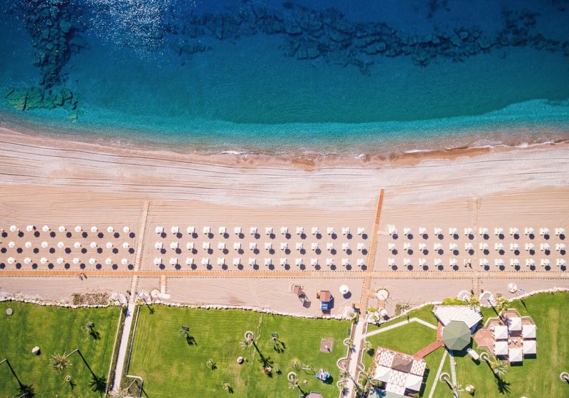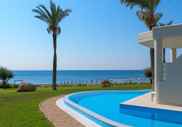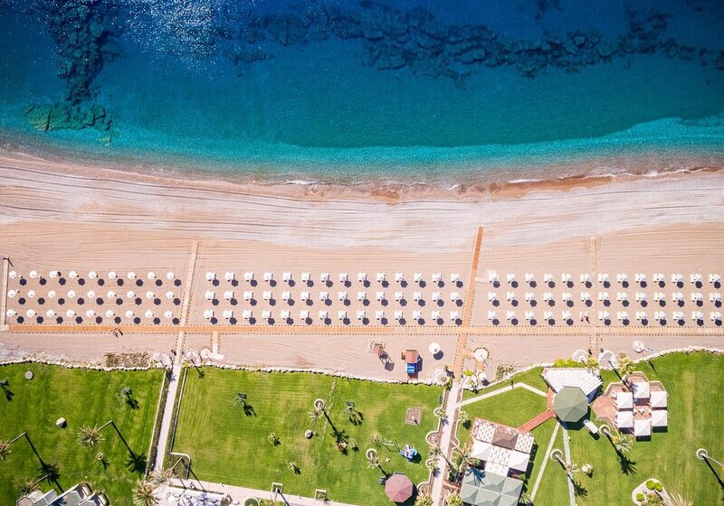 Willkommen im Rodos Palladium Leisure & Wellness, Eurem Rückzugsort direkt am Ammoudes Beach in Kalithea. Das Fünf-Sterne-Resort wurde 2024 renoviert und verbindet weiträumige Architektur mit klarer Organisation. Zwischen Haupt- und Nebengebäuden öffnet sich der Blick auf Meer und Poolbereiche. Hier erlebt Ihr entspannte Strandtage mit zuverlässigem Service und durchdachter Infrastruktur.