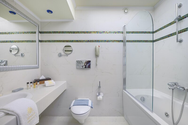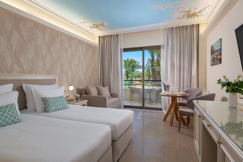 Die Zimmer im Atrium Palace sind großzügig geschnitten und mit allen modernen Annehmlichkeiten ausgestattet, beispielsweise mit einem Safe, einer Klimaanlage und einem Fernseher. Die Badezimmer sind mit Whirlpools ausgestattet und einige Zimmer haben sogar einen eigenen Pool.