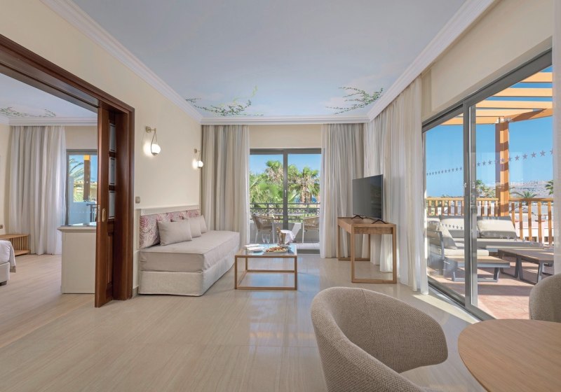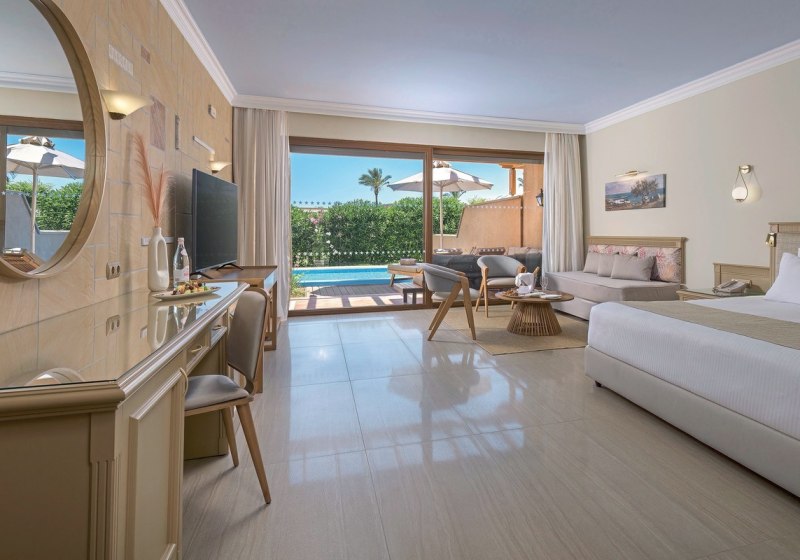 Für mehr Raum wählt Ihr Juniorsuiten mit Whirlpool im Badezimmer und Sitzecke oder Familiensuiten mit separatem Schlafzimmer. Einige Zimmer sind mit privatem Pool verfügbar, Schlafsofa und Kinderbett sind vorgesehen. Varianten mit Essecke, Wohnzimmer oder Twin-/Doppelbett stehen je nach Kategorie bereit. So findet Ihr vom Paarzimmer bis zur Familiensuite ein passendes Setup. Highlight: Auswahl bis zur Suite mit privatem Pool für maximale Privatsphäre.