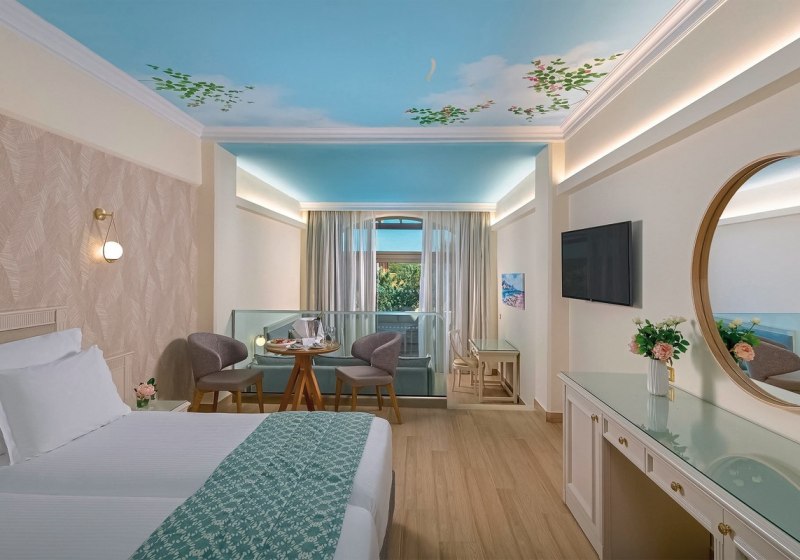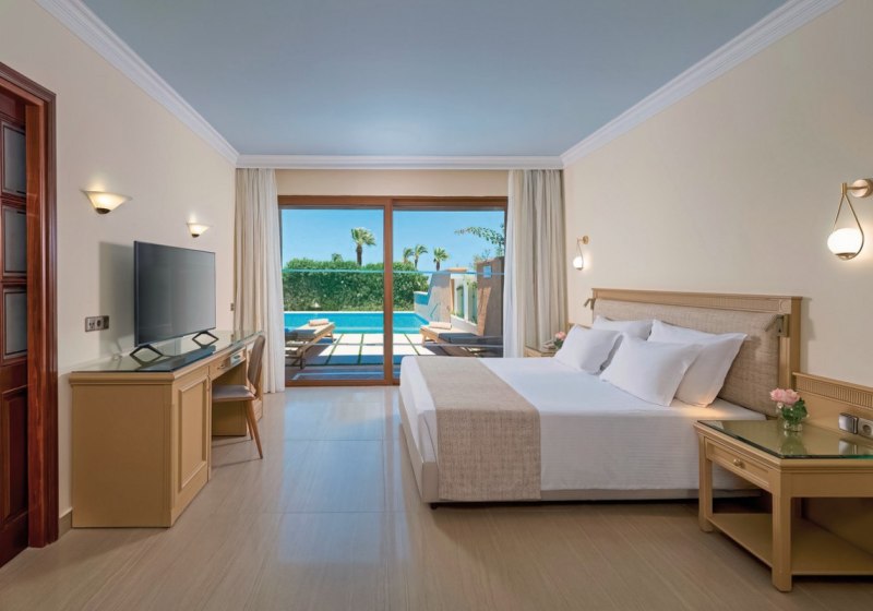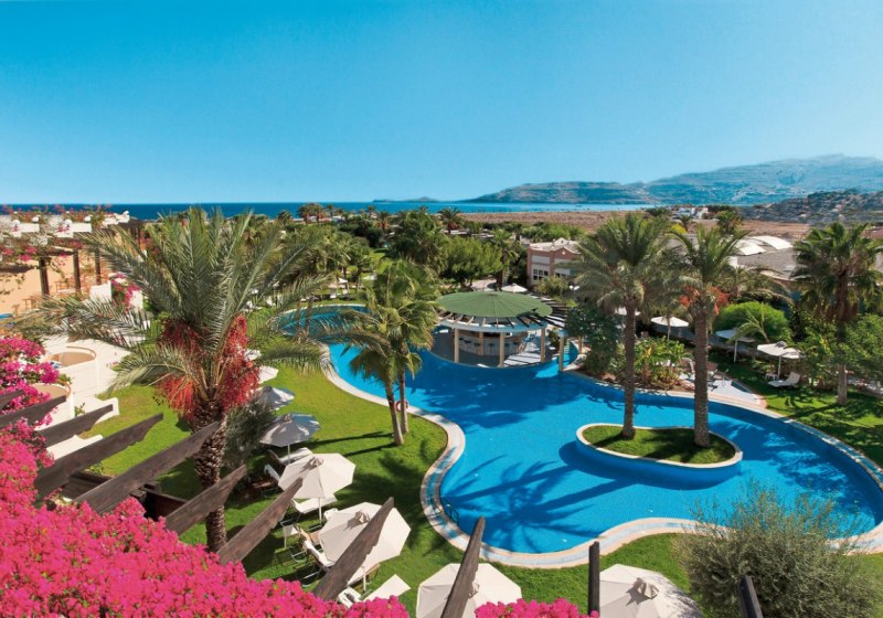 Mit 320 Zimmern und 19 Villen wirkt die Anlage professionell organisiert: 24-Stunden-Rezeption, WLAN überall, Minimarkt, Juwelier, Friseur und Geldautomat geben Struktur und Komfort. Kulinarisch wechselt Ihr zwischen griechischem Gourmet, mediterranen und asiatischen Akzenten sowie italienischer Küche; an Pool-, Lobby- und Strandbar läuft der Tag rund. Abends sorgen Themenabende und Live-Musik für Atmosphäre, tagsüber stehen Kurse und Aktivitäten bereit. Highlight: Vielseitige Gastronomie mit vier À-la-carte-Restaurants und stimmigen Bars.