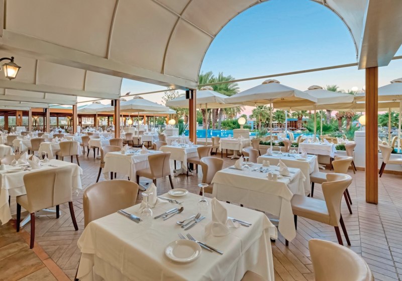 Die Infrastruktur ist umfassend: 320 Zimmer, darunter 19 Villen, verteilen sich um sechs Süßwasserpools und einen Innenhof mit Wassergarten. Die 24-Stunden-Rezeption, WLAN in der gesamten Anlage und der gläserne Panoramalift sorgen für reibungslose Abläufe. Minimarkt, Juwelier, Friseur und Geldautomat geben zusätzliche Bequemlichkeit vor Ort. Highlight: Sechs Außenpools mit ausreichend Liegen, Schirmen und Badetüchern.