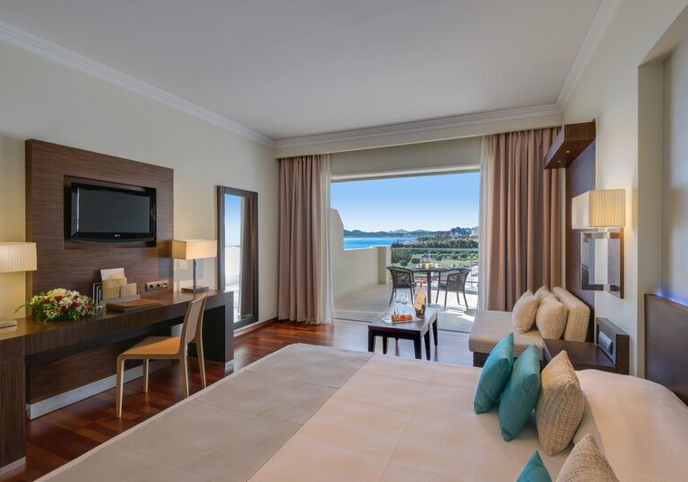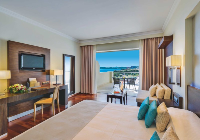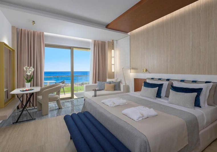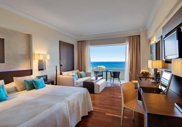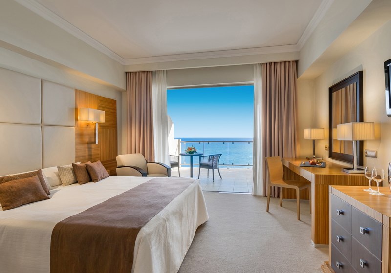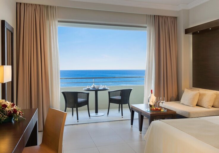Alle Zimmer bieten Bad oder Dusche/WC, Föhn, Klimaanlage, Bademantel und Pantoffeln, Telefon, WLAN, Sat‑TV, Kühlschrank, Kaffee-/Teezubereiter, Safe und möblierten Balkon; viele blicken aufs Meer. Premium‑Deluxe‑Zimmer im Eos/Helios‑Gebäude verfügen über eine Walk‑in‑Regendusche.