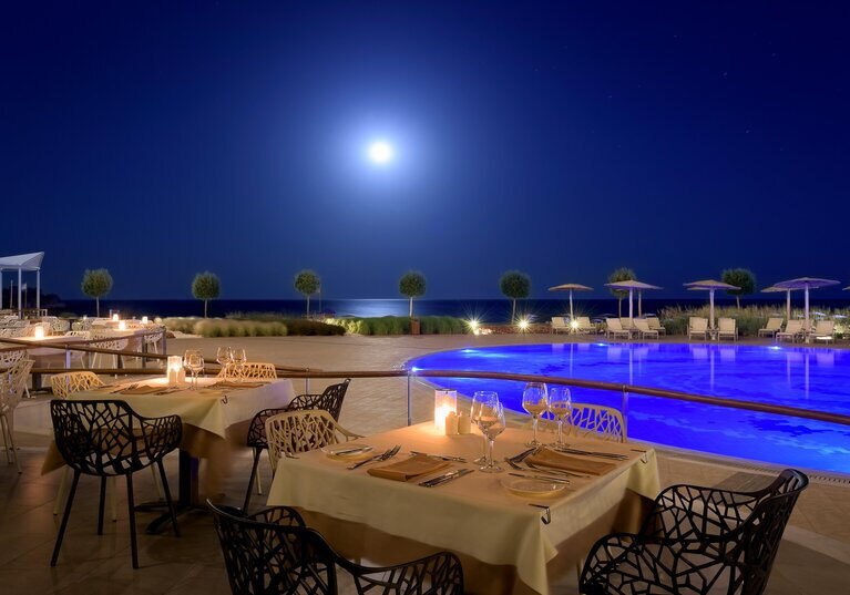 Zwischen Loungebar, Poolbar und Beachbar variiert Ihr Euren Rahmen von entspannt bis elegant. Verpflegungsoptionen reichen von Frühstück bis Halbpension und darüber hinaus. Vegetarische, vegane sowie laktose- und glutenfreie Speisen sind verfügbar; auf Wunsch rundet Zimmerservice Euren Abend diskret ab.