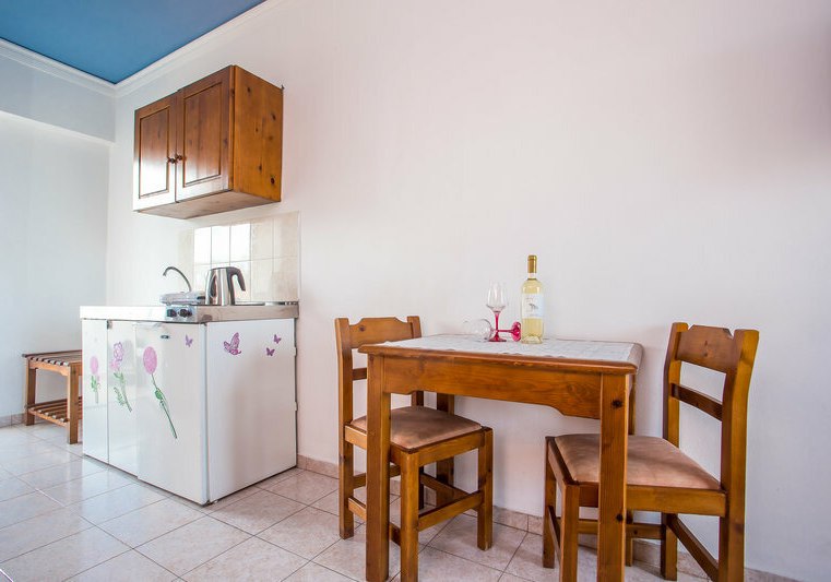 Die Studios des Iatridis Studios sind für Selbstversorgung konzipiert. Kitchenette, Wasserkocher und Kühlschrank geben Euch die Freiheit, den Tagesablauf unabhängig von festen Zeiten zu gestalten. In 50 Metern findet Ihr einen Supermarkt für den schnellen Einkauf, sodass Ihr morgens wie abends flexibel bleibt und Eure Lieblingsprodukte griffbereit habt.
