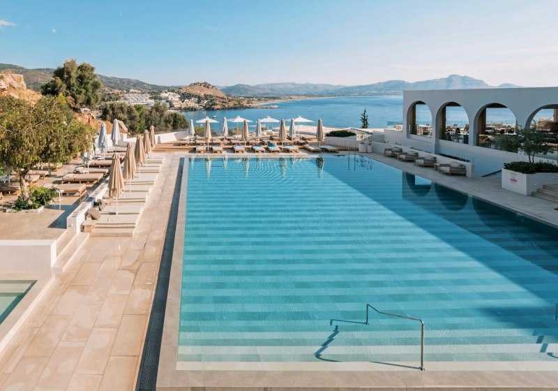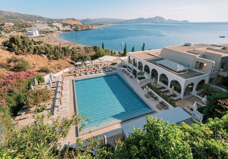 Im Lindos Mare Seaside Hotel wohnt Ihr in Hanglage über der Bucht von Vlicha, direkt am Sand-/Kiesstrand. Die Architektur staffelt sich den Hang hinab, verbunden durch Aufzüge und eine Seilbahn zur Bucht. Zwei Süßwasserpools mit Sonnenterrasse, ein separater Kinderpool und beschattete Ruheplätze schaffen klare Zonen für Rückzug und Badezeiten am Meer.