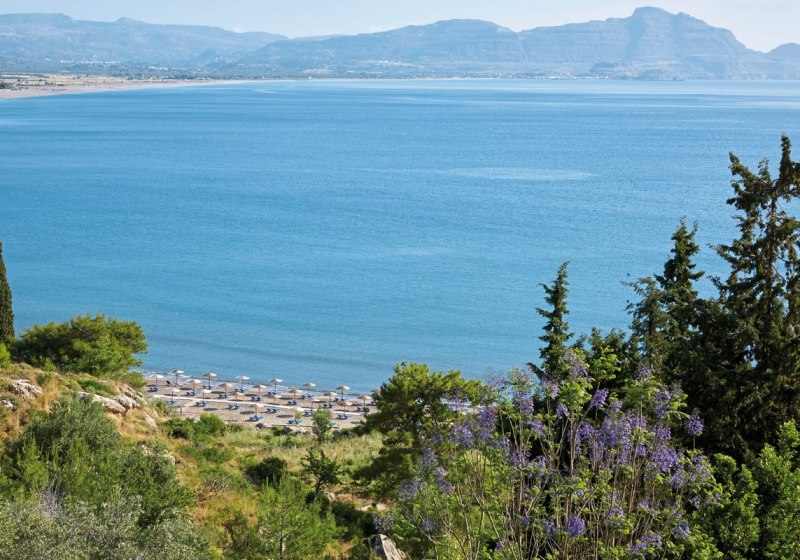 Das Hotel liegt oberhalb der Vlicha-Bucht, direkt am Sand-/Kiesstrand. Lindos erreicht Ihr nach etwa 2,5 Kilometern, Rhodos-Stadt nach ungefähr 46 Kilometern. Zum Flughafen sind es rund 45 Kilometer. Eine Bushaltestelle befindet sich etwa 100 Meter entfernt, sodass Ihr Ausflüge pragmatisch plant und flexibel gestaltet.