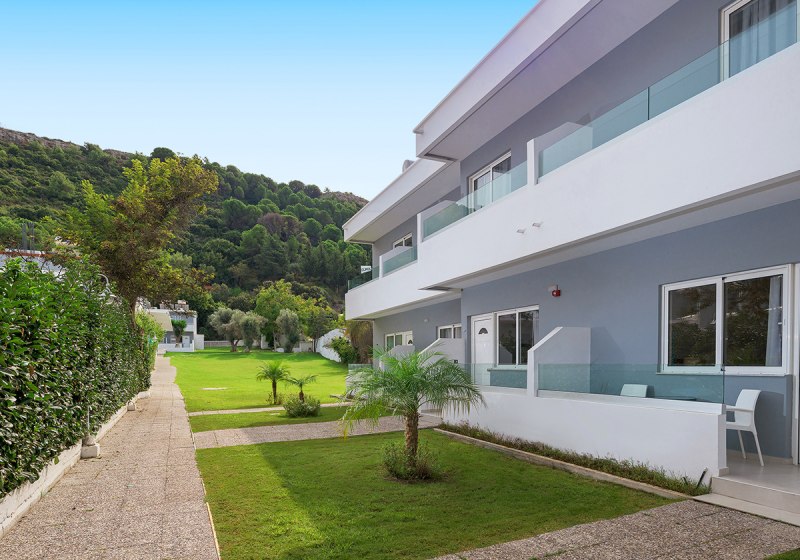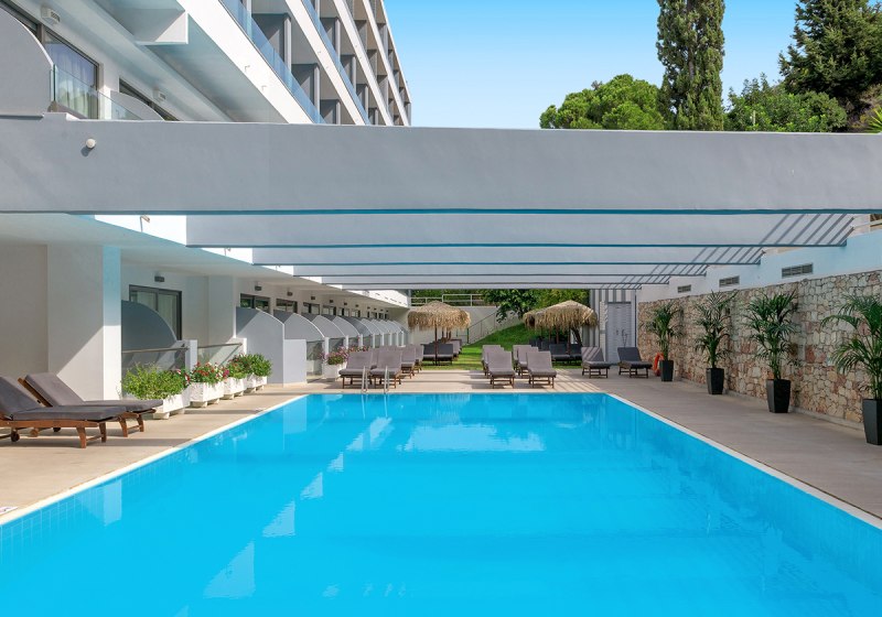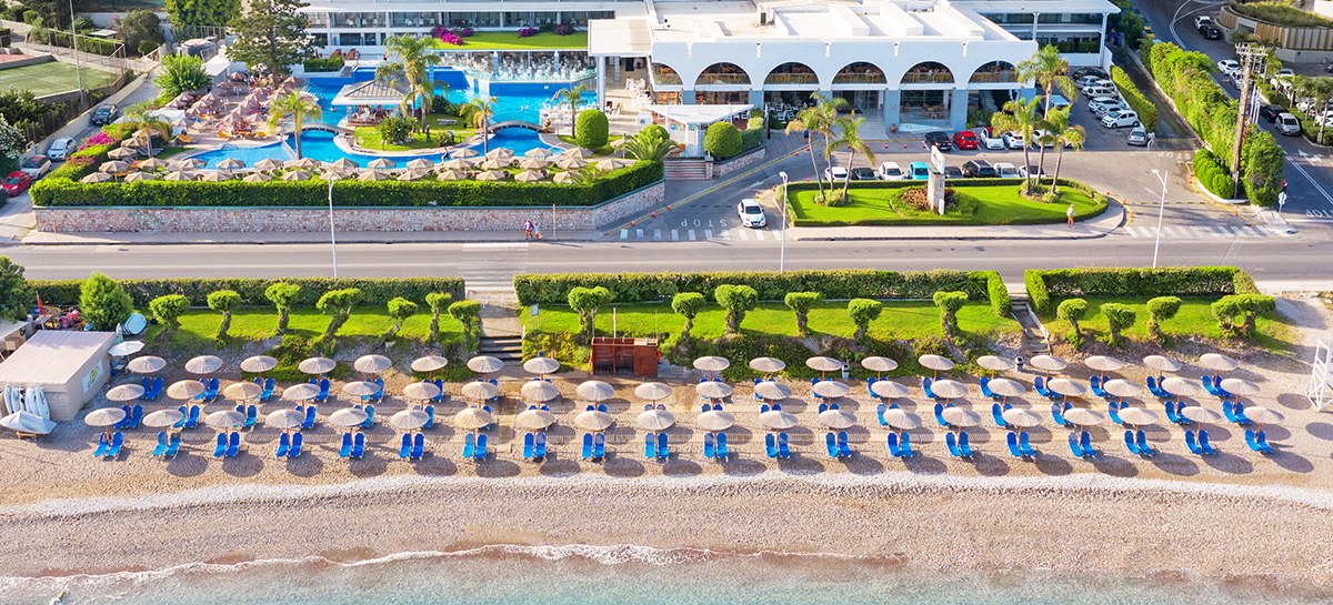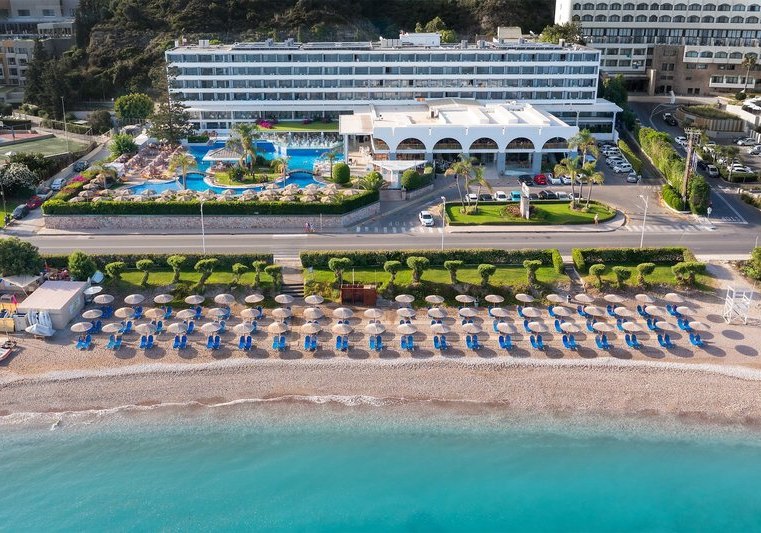Das Oceanis Beach Hotel liegt in Trianta/Ixia, 50 Meter vom Kies-/Sandstrand, getrennt durch eine Hauptstraße. Bis Rhodos-Stadt sind es etwa 5 Kilometer, der Flughafen liegt rund 10 Kilometer entfernt. Direkt vor dem Hotel befindet sich eine Bushaltestelle, ideal für Ausflüge und spontane Abstecher in die Inselhauptstadt.