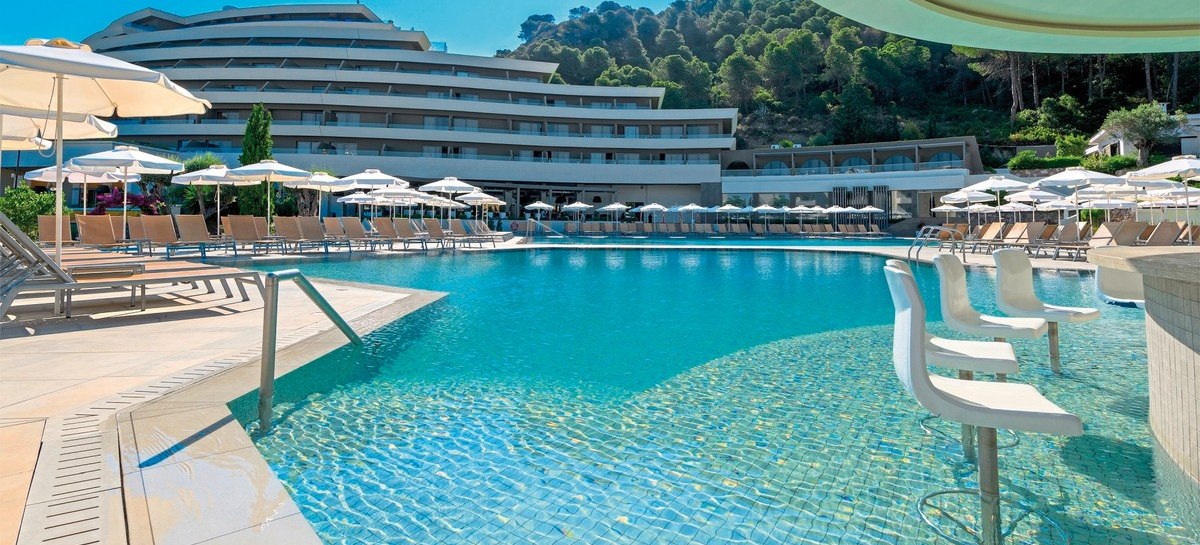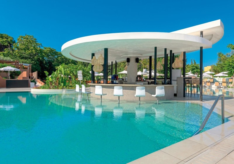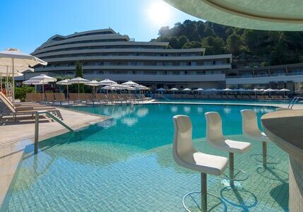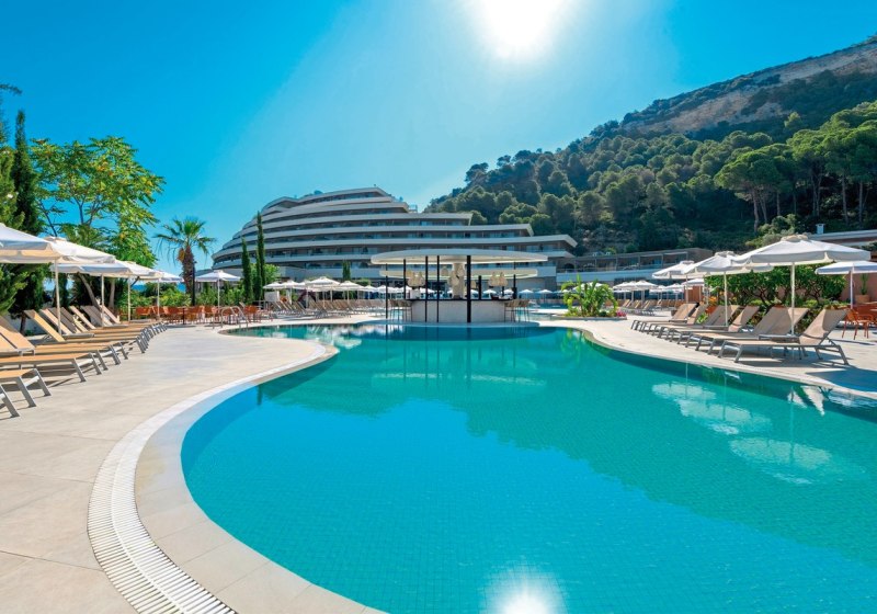 Die Anlage bietet 24-Stunden-Rezeption, vier Lifte, kostenloses WLAN, Shops, Minimarkt und Friseur. Drei Außenpools, Kinderpool und Poolbar strukturieren den Tag, dazu kommt ein Hallenbad mit Servicezeiten von 10:00 bis 20:00 Uhr. Highlight: Eigener Strandabschnitt mit Liegen und Schirmen in rund 100 Metern.