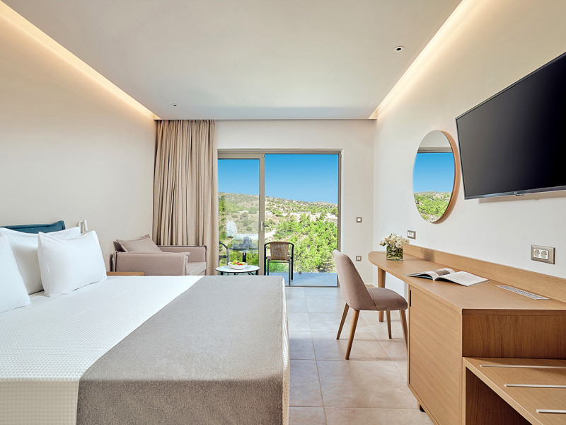 Jede Einheit bietet Balkon oder Terrasse, teils mit Garten-, Berg- oder Poolblick. Twin- oder Doppelbetten, Schlafsofa und auf Wunsch Kinderbett schaffen flexible Schlafsituationen. Familienzimmer mit Schiebetür, Dusche/WC, Sofabett und Terrasse bieten strukturierte Bereiche. Es gibt 146 Doppelzimmer und drei Juniorsuiten.