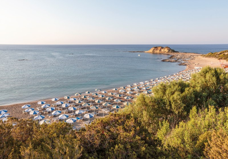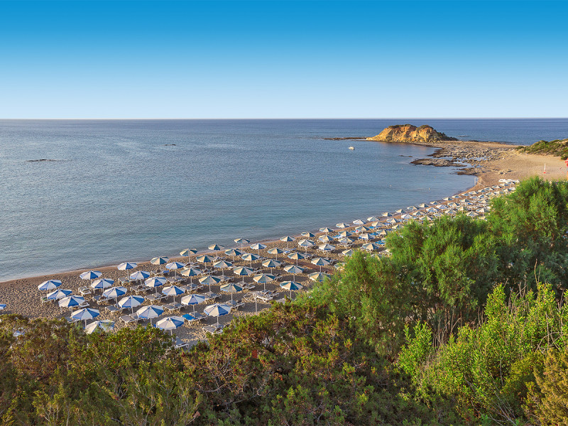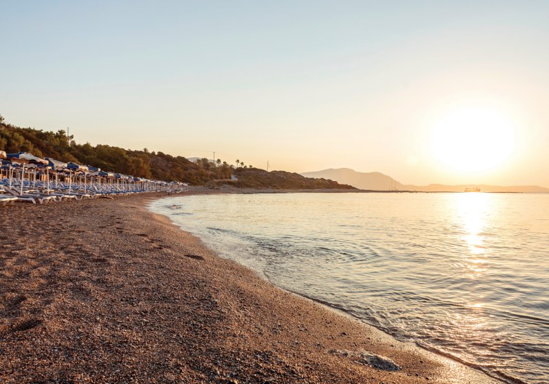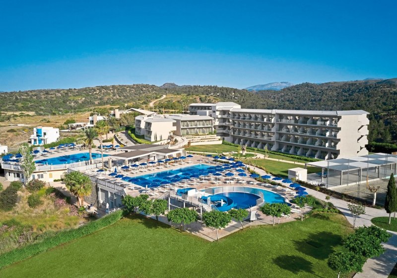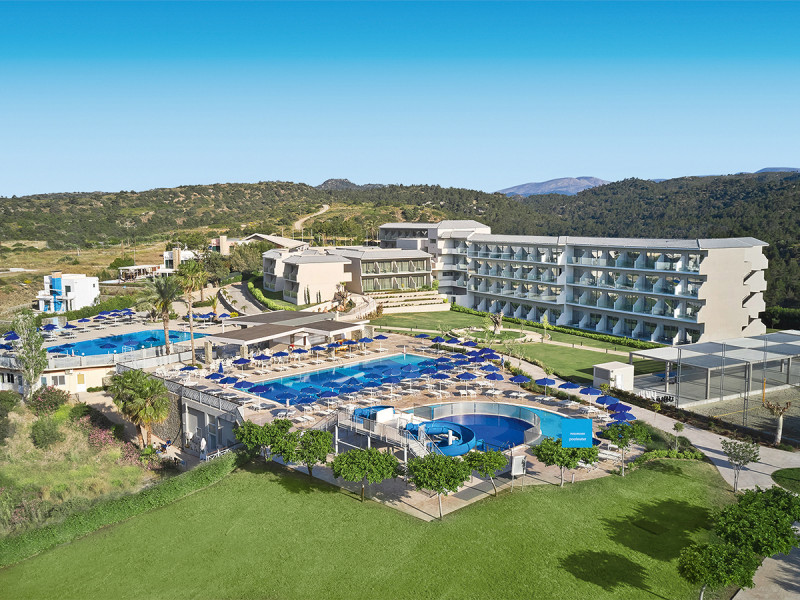 Die Anlage steht auf einem Hügel, etwa 800 Meter vom Sand-/Kiesstrand entfernt. Ein Hotelshuttle erleichtert Euch den Transfer. Laut Distanzangaben erreicht Ihr die Bushaltestelle in rund 500 Metern; Lardos und Asklipion liegen jeweils etwa 7 Kilometer entfernt, Lindos rund 17 Kilometer. Der Flughafen Diagoras ist mit etwa 60 Kilometern gut angebunden.