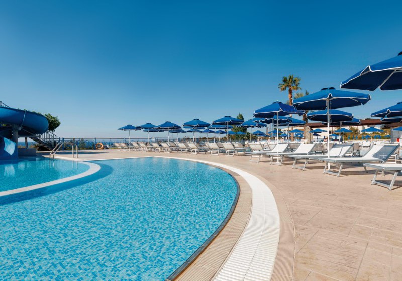 Im Princess Sun Hotel & Spa wohnt Ihr auf einem Hügel mit weitem Blick und kurzen Wegen zum Meer. Drei Außenpools strukturieren die Anlage, einer davon mit Rutschen, daneben ein separates Kinderbecken mit Wasserrutschen. Die Atmosphäre wirkt lebhaft und zugleich geordnet: Familien, Paare und aktive Reisende finden klare Bereiche für Spiel, Sport und ruhige Stunden.