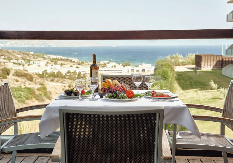 Für Familien wichtig: ein Kinderbuffet und Kindermenüs. Spezielle Ernährungswünsche decken vegane und laktosefreie Optionen ab, Babynahrung ist ebenfalls vorgesehen. Am Strand versorgt Euch die Beachbar Diogenis in der Saison von 1. Mai bis 2. November zwischen 10:00 und 18:00 Uhr mit Getränken.