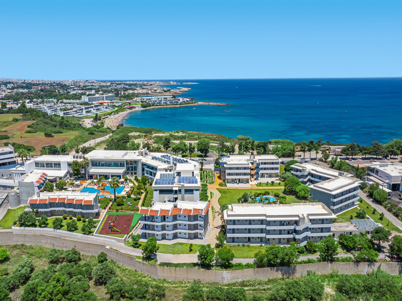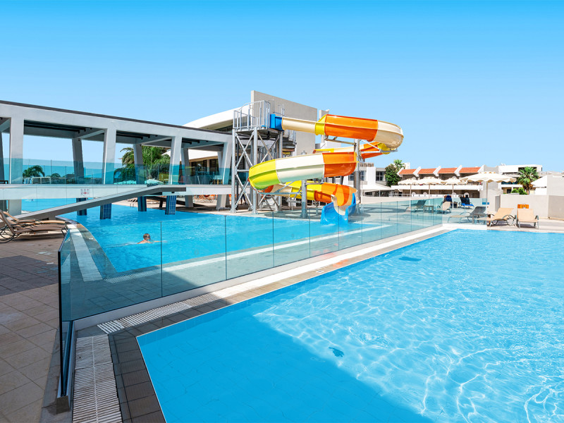 Virginia Family Resort verbindet Familienfreundlichkeit mit einer klar strukturierten Resort-Atmosphäre. Zwischen dem Haupthaus und zweigeschossigen Nebengebäuden verteilt, erlebt Ihr eine weitläufige Anlage mit drei Außenpools, einer markanten Wasserrutsche und eigener Kinderzone. Das Amphitheater setzt abends Akzente, tagsüber führen kurze Wege zu Spielplatz, Miniclub und den sonnigen Terrassen. Der Strand liegt rund 150 Meter entfernt; der Fußweg ist steil, belohnt Euch aber mit Sand-Kies-Ufer und der nahen Badebucht von Kallithea.