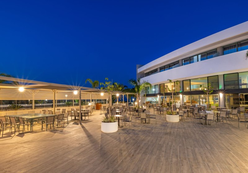 Die Infrastruktur ist auf unkomplizierte Abläufe ausgerichtet: 24‑h‑Rezeption, Gepäckraum, Aufzüge und Wi‑Fi in der gesamten Anlage halten Wege kurz. Drei Außenpools – einer mit Wasserrutsche – und ein separater Kinderpool verteilen den Tag zwischen Aktivität und Ruhe. Liegen und Schirme am Pool, Sonnenterrassen und Außenmöbel schaffen klare Zonen zum Lesen, Planschen oder Zuschauen.