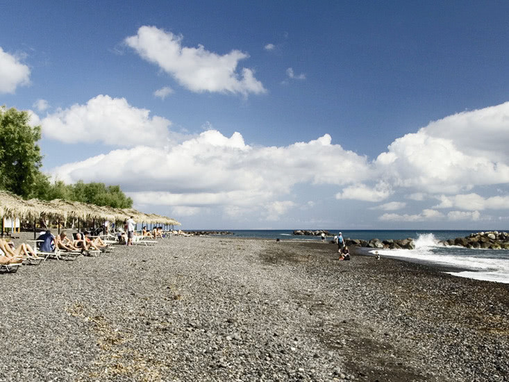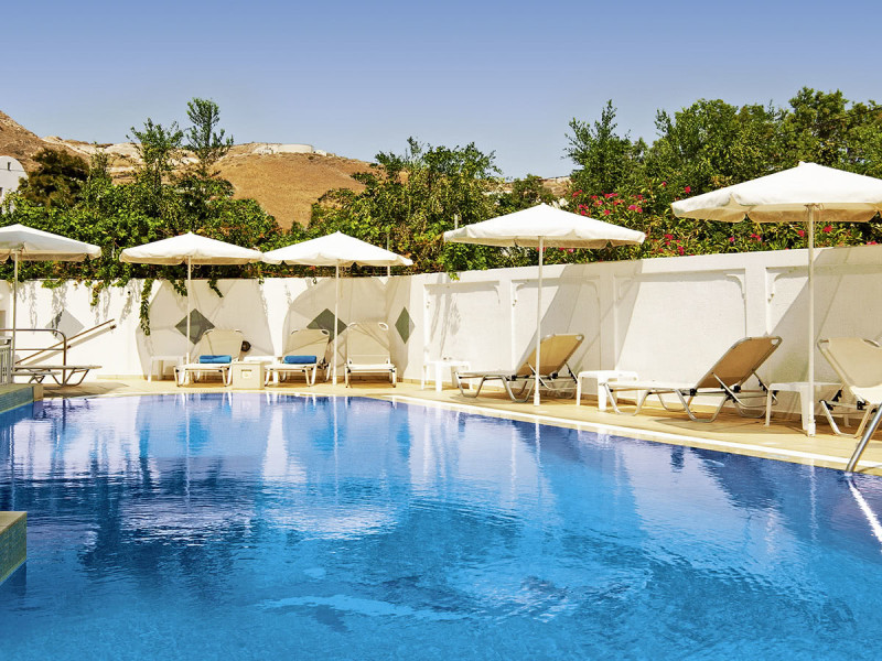 Ihr residiert in Kamari auf Santorini, ruhig und gleichzeitig zentral. Der schwarze Lavastrand mit Kieseln und die lebendige Promenade liegen rund 150 Meter entfernt. Entlang der Uferzeile warten Restaurants, Bars und Geschäfte. Der Weg dorthin ist kurz, der Rückzugsort im Hotel angenehm abgeschirmt.