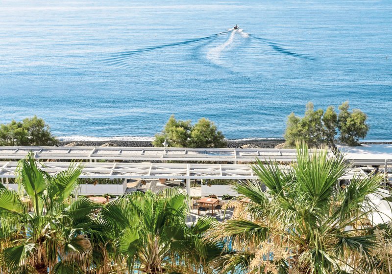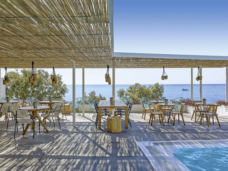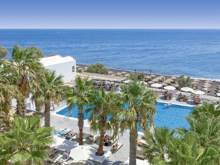 Im Kamari Beach Hotel wohnt Ihr unmittelbar an der Promenade von Kamari, nur durch den Weg vom schwarzen Lavastrand getrennt. Die Anlage wirkt überschaubar und klar strukturiert: Wege führen über Terrassen und durch Grünflächen zum Außenpool, zu Lounges und zum Frühstücksraum mit Terrasse. Ihr spürt Strandnähe, kurze Wege und eine angenehme, unkomplizierte Ferienroutine.