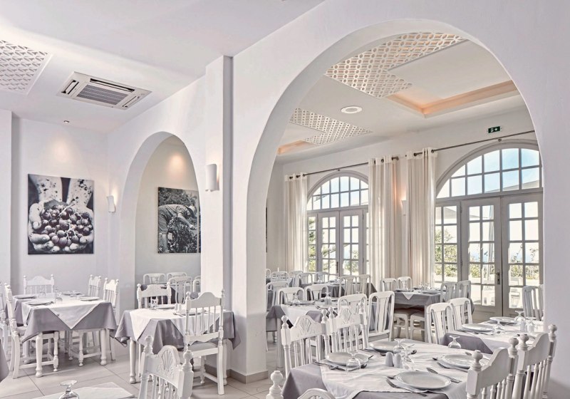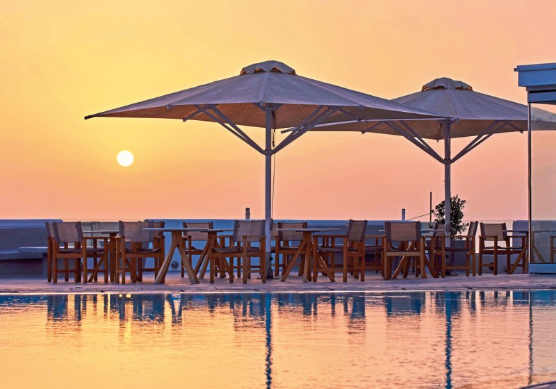 Santorini Palace Hotel verbindet zentrale Lage, Pools drinnen und draußen, Miniclub sowie ein solides Spa zu einem vielseitigen Rahmen für eure perfekten Ferien. Verpflegung von Frühstück bis Abendessen, Bar und Poolbar halten den Tag fließend.
