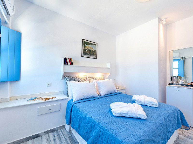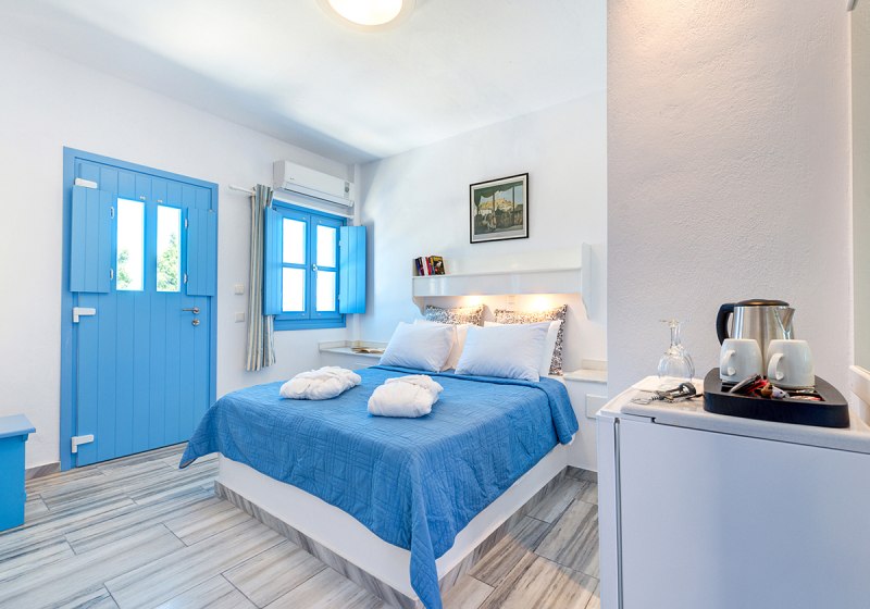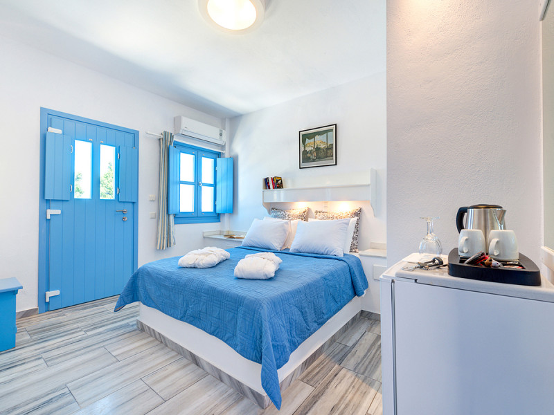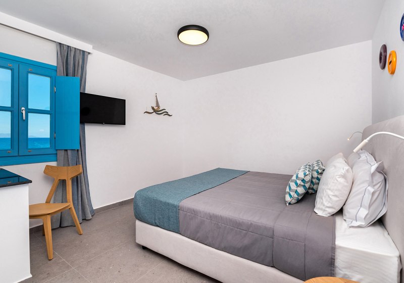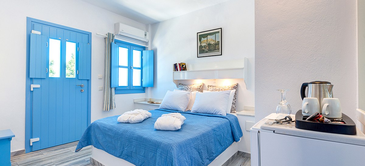 Die Zimmer mit Balkon oder Terrasse öffnen sich zur Brise des Ägäischen Meers; einige bieten Meer- oder seitlichen Meerblick. Wer mehr Raum schätzt, wählt Appartements im Nebengebäude, teils mit zwei oder drei Schlafzimmern oder mit Kitchenette. WLAN ist im gesamten Hotel inklusive, Liegen und Schirme am Strand ebenso. Highlight: Direkte Strandlage am Lavastrand, kurzer Weg zwischen Zimmer, Pool und Meer.