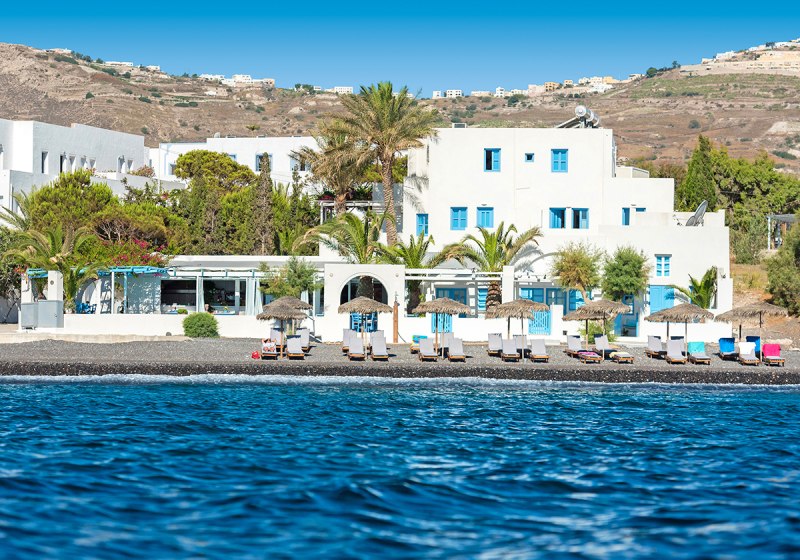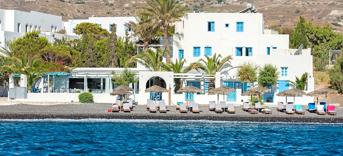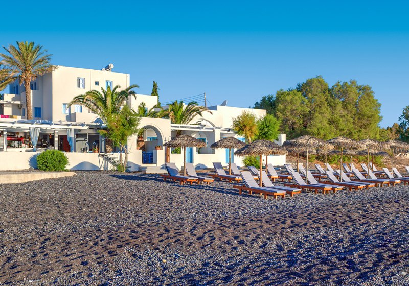 - Schwarzer Strand: Direkt am Lavastrand von Kamari, ohne Straße dazwischen.