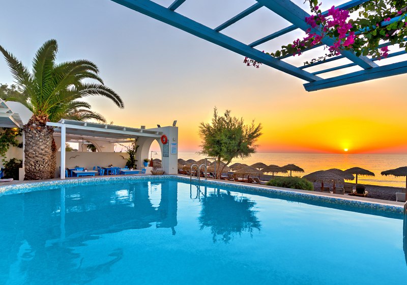 Im Sigalas Hotel wohnt Ihr direkt am schwarzen Lavastrand von Kamari. Das Haus wirkt intim und überschaubar, mit kurzen Wegen zwischen Pool, Frühstücksbereich und Strandliegen. Familien, Strandurlauber und auch Gay-Friendly Reisende finden hier einen unkomplizierten Rhythmus: morgens à la carte frühstücken, tagsüber zwischen Meer und Süßwasserpool wechseln, abends entspannt in den Ort spazieren.