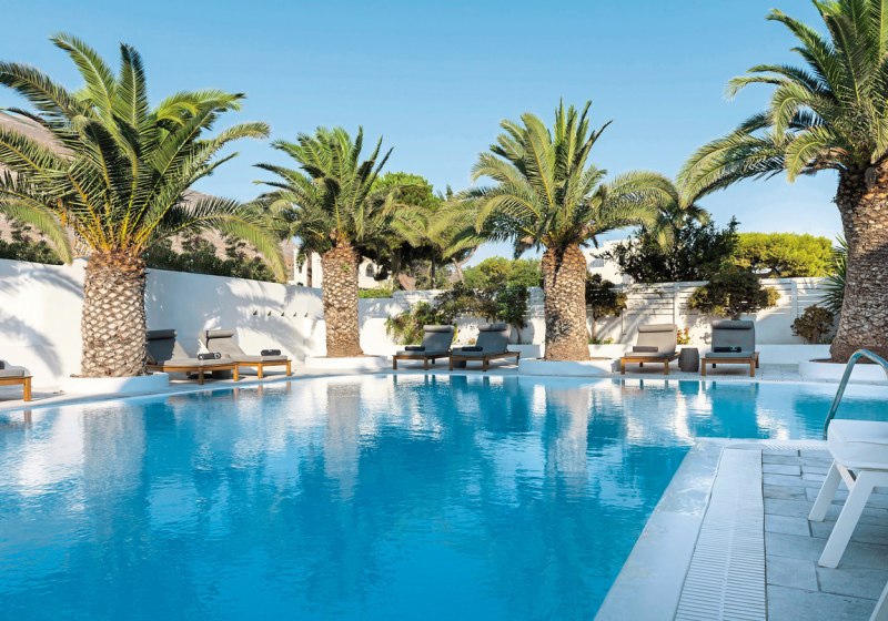 Strogili Hotel steht für ruhige Tage in bester Kamari-Lage: 150 Meter zum Lavastrand, 50 Meter ins Zentrum, 100 Meter zur Bushaltestelle. Adults Only sorgt für einen konzentrierten Rahmen, der Poolbereich und das Frühstücksbuffet für einen klaren Tagesrhythmus.