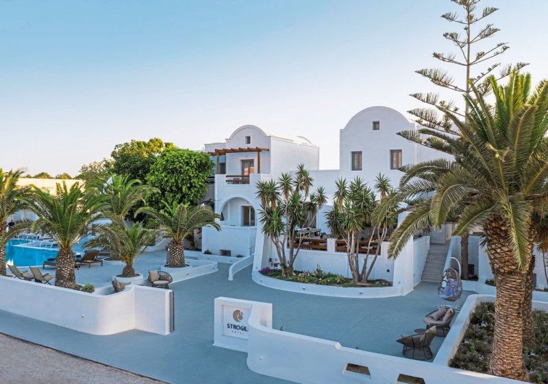 Im Strogili Hotel wohnt Ihr in einem Erwachsenenhotel mit klarer Linie: 40 Zimmer, aufgeräumte Architektur und ein ruhiger Rhythmus, der sofort Tempo aus dem Tag nimmt. Der schwarze Lavastrand von Kamari liegt nur 150 Meter entfernt, das Dorfzentrum erreicht Ihr in 50 Metern. Ihr startet den Tag am Frühstücksbuffet, zieht Bahnen im Swimmingpool und habt WLAN inklusive, wenn Ihr zwischendurch etwas nachsehen möchtet. Die Atmosphäre ist entspannt, der Service präsent, ohne aufdringlich zu sein.